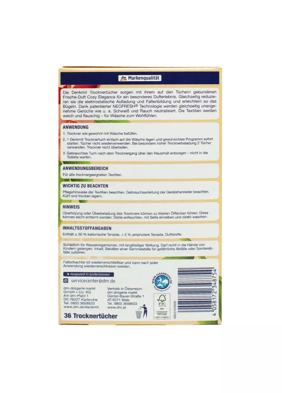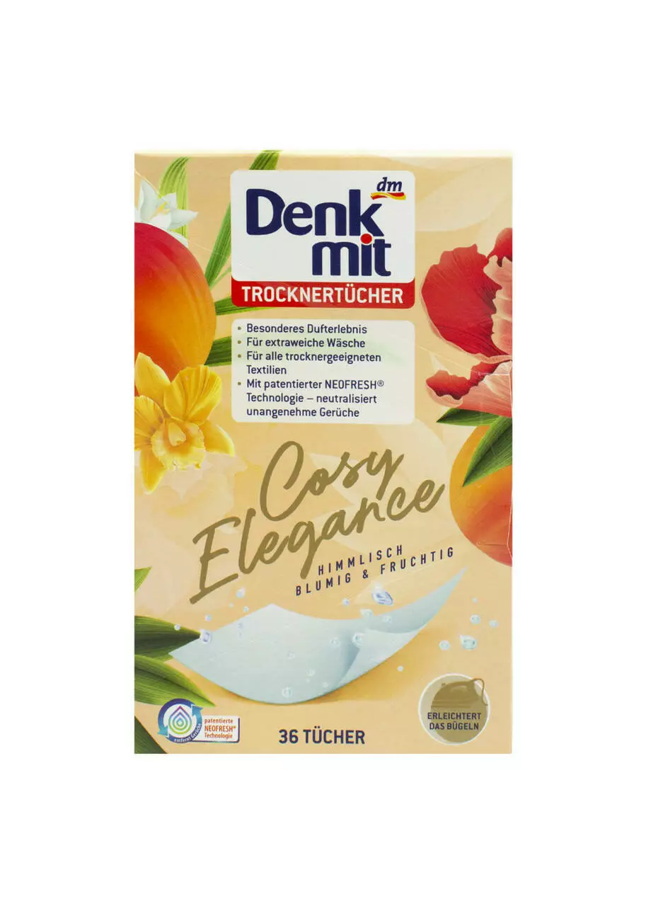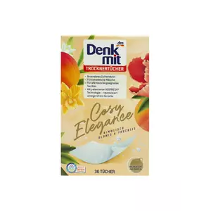 Завдяки свіжому аромату Cozy Elegance, серветки для сушильної машини Denkmit забезпечують особливий аромат. У той же час вони зменшують електростатичний заряд і зминання, полегшуючи прасування. Також нейтралізуються такі запахи, як піт і дим. Тканини одягу стають м'якими та пухнастими - щоб білизна була приємною на дотик.