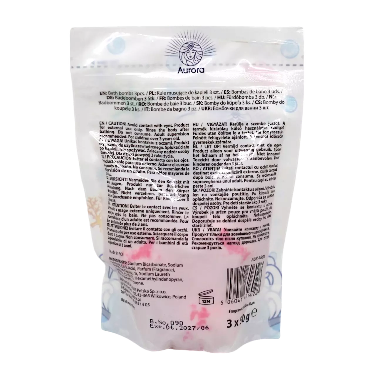Бомбочки для ванни Aurora Bubble Gum перетворять звичайну процедуру в захопливу й ароматну подорож, забезпечуючи відчуття чистоти і свіжості."