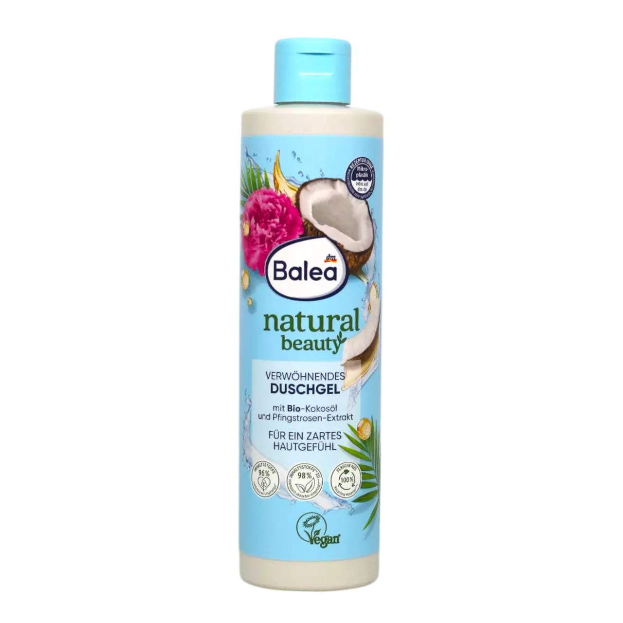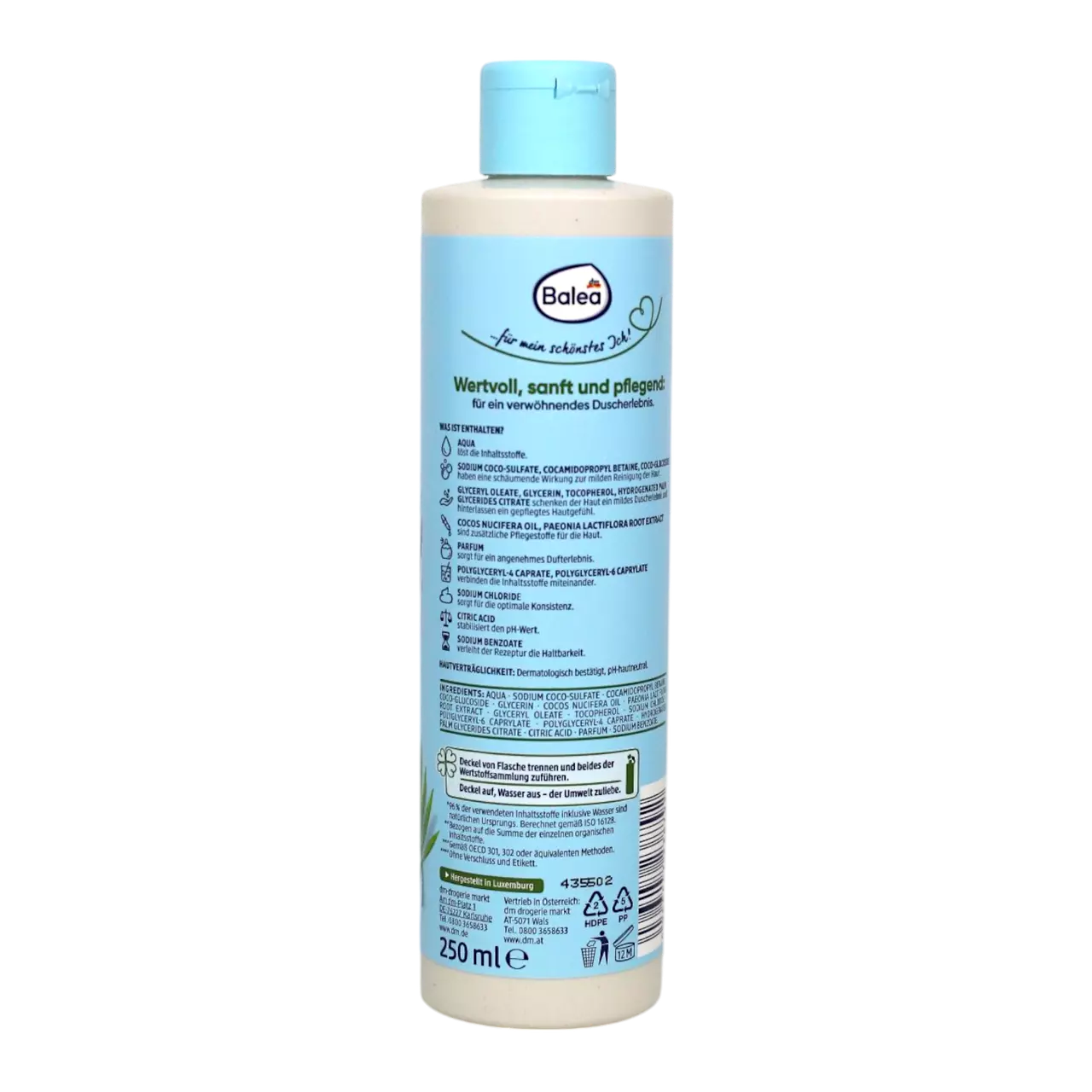 Balea Гель для душу Півонія та кокосова олія 250 мл – це ідеальний вибір для тих, хто хоче насолоджуватися приємним очищенням шкіри з глибоким зволоженням і ніжним ароматом."
