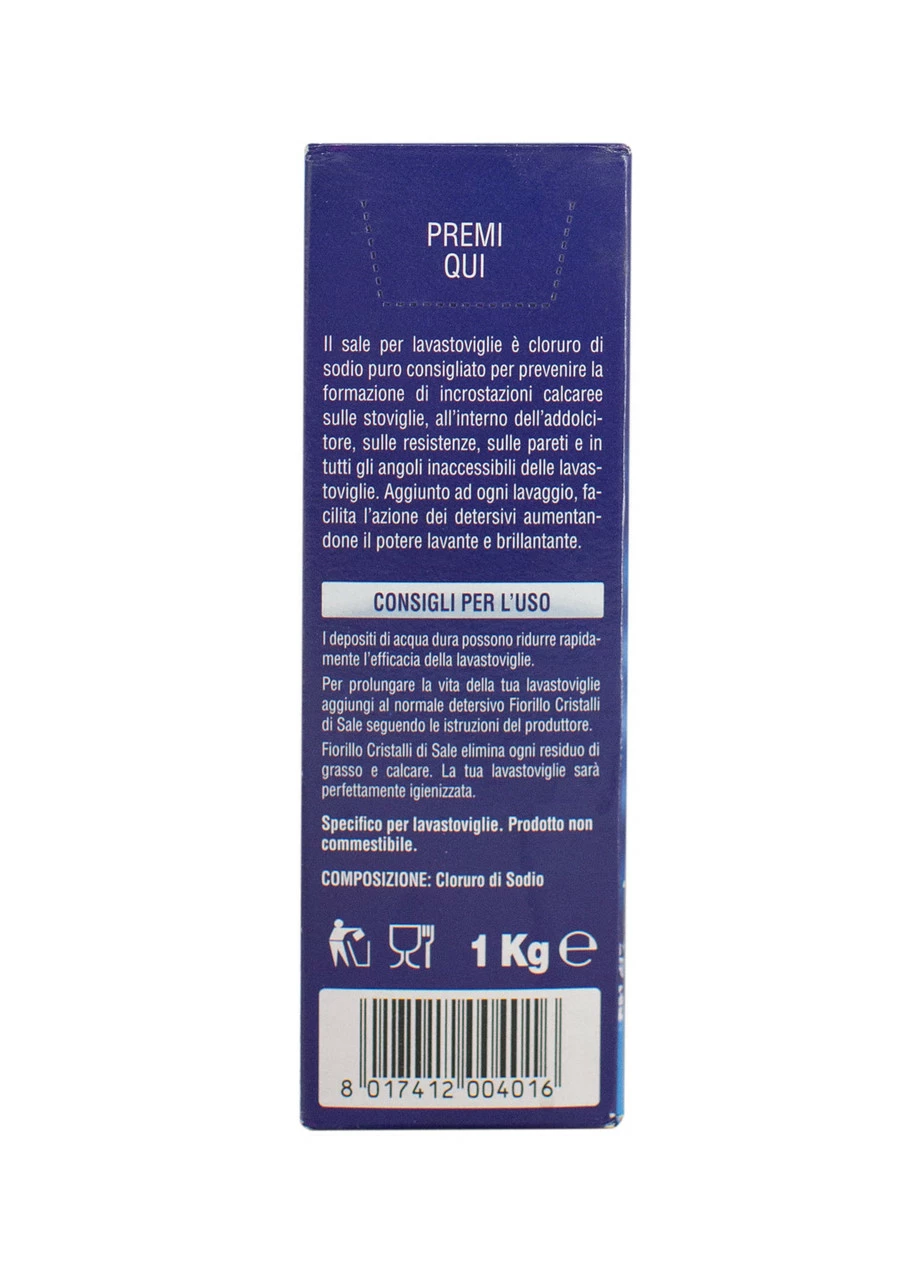 Сіль для посудомийних машин Fiorillo — це чистий хлорид натрію, рекомендований для запобігання утворенню вапняних відкладень на посуді, всередині пом’якшувача води, на нагрівальних елементах, на внутрішніх поверхнях і в усіх недоступних куточках посудомийних машин. Доданий під час кожного застосування, він полегшує дію миючих засобів, підвищуючи їх очисну та освітлюючу дію.