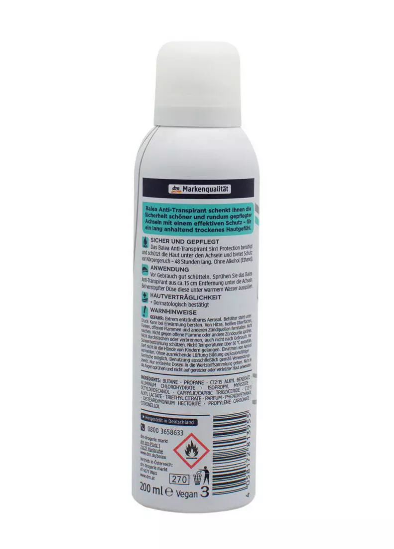 Дезодорант антиперспірант спрей для жінок Balea 5в1 захищає від запаху поту протягом 48 годин.