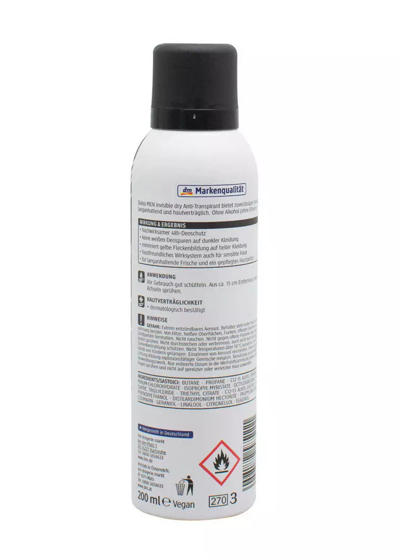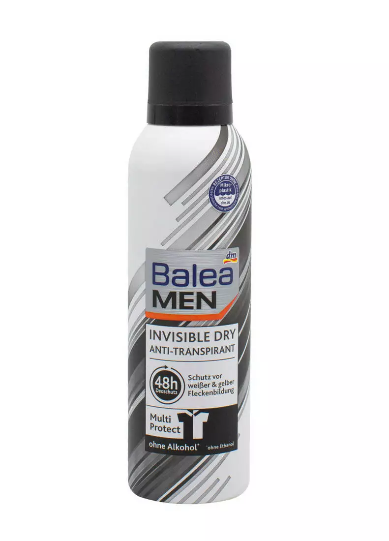 Виведення плям від дезодоранту викликає таке саме роздратування, як і запах поту, до того ж це може призводити до пошкодження речей. Аерозольний антиперспірант Balea Men Invisible Dry Anti-Perspirant вирішить цю проблему, адже його інтенсивна формула містить спеціальні компоненти, які не дають дезодоранту проявлятись на тканині. Продукт створений на основі запатентованої формули з компонентами, що інтенсивно діють, які блокують виділення поту, борються з хвороботворними бактеріями і дозволяють відчувати себе впевнено протягом 48 годин.