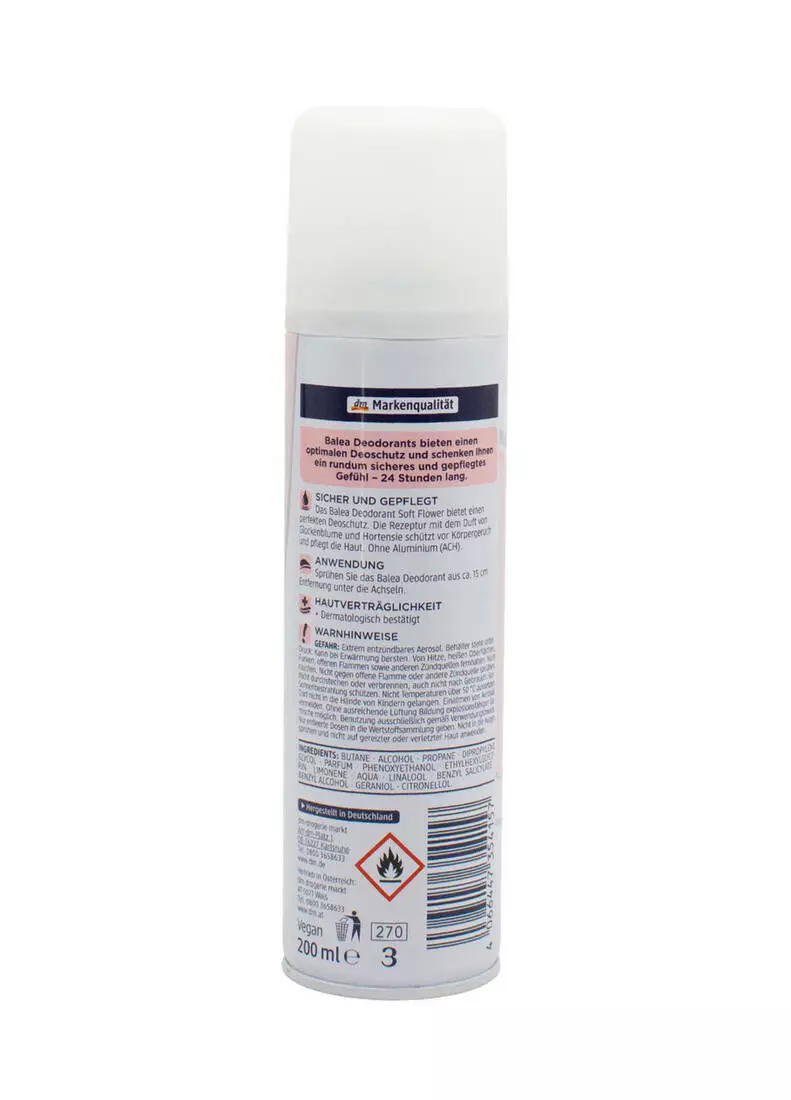 Формула продукту є веганською і не містить солей алюмінію. Насолоджуйтесь чистою свіжістю із дезодорантом Balea Soft Flower!