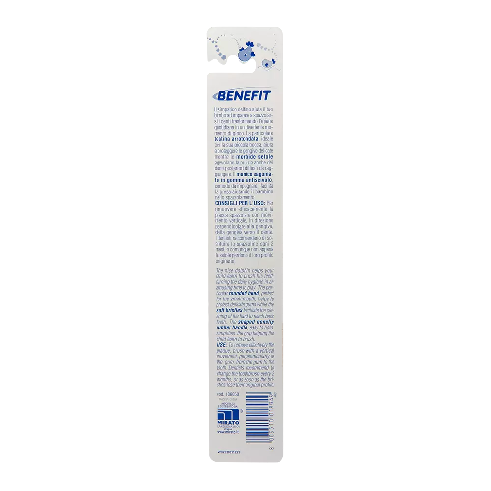 Симпатичний дельфін допомагає вашій дитині навчитися чистити зуби, перетворюючи щоденну гігієну в цікавий час для ігор. Заокруглена голівка щітки, що ідеально підходить для маленького рота допомагає дістатися до задніх зубів, а м'яка щетина не пошкоджує ніжні ясна. Гумова ручка має зручну форму щоб допомагати дитині навчитися чистити зубки щіткою.