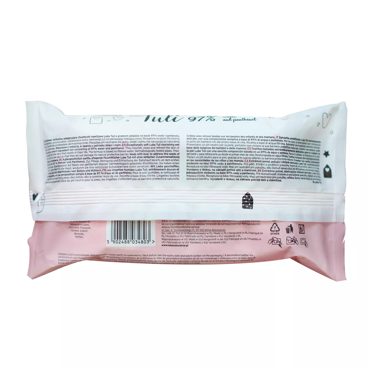 97% чистої води та есенція на основі пантенолу, яка заспокоює, зволожує та пом'якшує шкіру малюка. Серветки мають нейтральний рівень pH, тому підходять для малюків з перших днів життя.