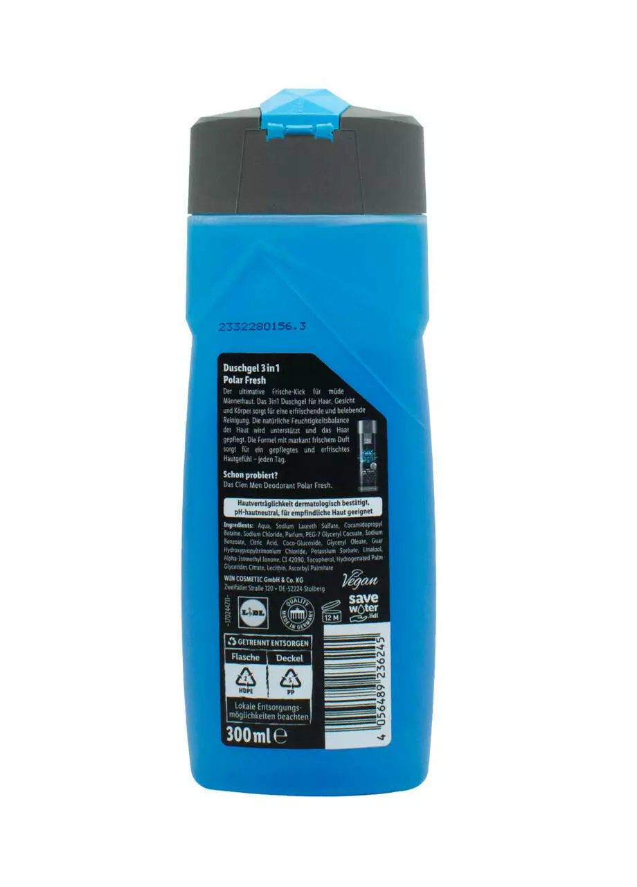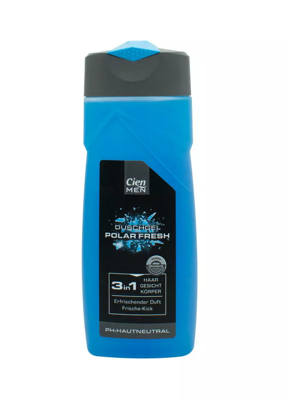 Шампунь-гель Cien Polar Fresh 3в1 - засіб для комплексного догляду для чоловіків. Гель для душу, шампунь і засіб для вмивання. Освіжаючий аромат надихає та додає енергії під час прийому душу. М'яка формула не сушить шкіру та має нейтральний рівень рН. Дерматологічно протестовано.
