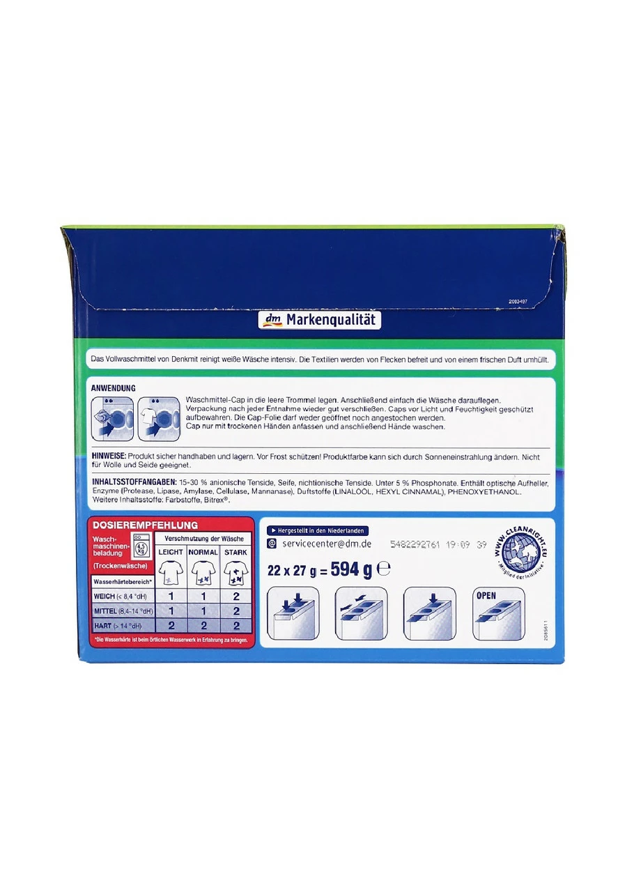 Спосіб застосування: Помістіть капсулу для прання кольорових речей від Denkmit в порожній барабан пральної машинки. Тоді просто покладіть білизну зверху. Запустіть прання як звичайно.
