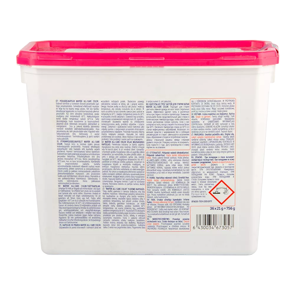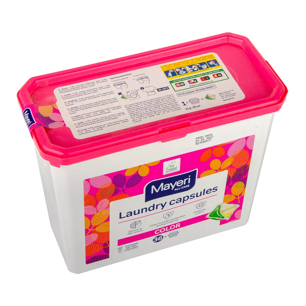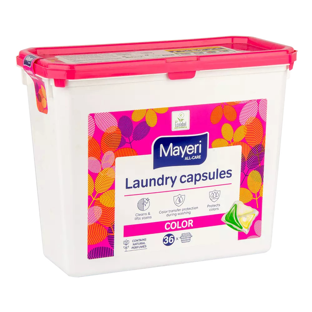 Трьох-компонентні рідкі капсули для білизни Mayeri Color. Підходить як для кольорової, так і для темної одягу у всіх типах пральних машин. Довше зберігає кольори яскравими і захищає від вицвітання. Видаляє бруд і різні плями (кава, чай, червоне вино, фруктовий сік, томатне пюре, гірчиця, морква, кров, косметика, трава, бруд, шоколад), ефективні при пранні теплою або гарячою водою. Повністю розчинні, не залишають залишків на білизну або в пральній машині.