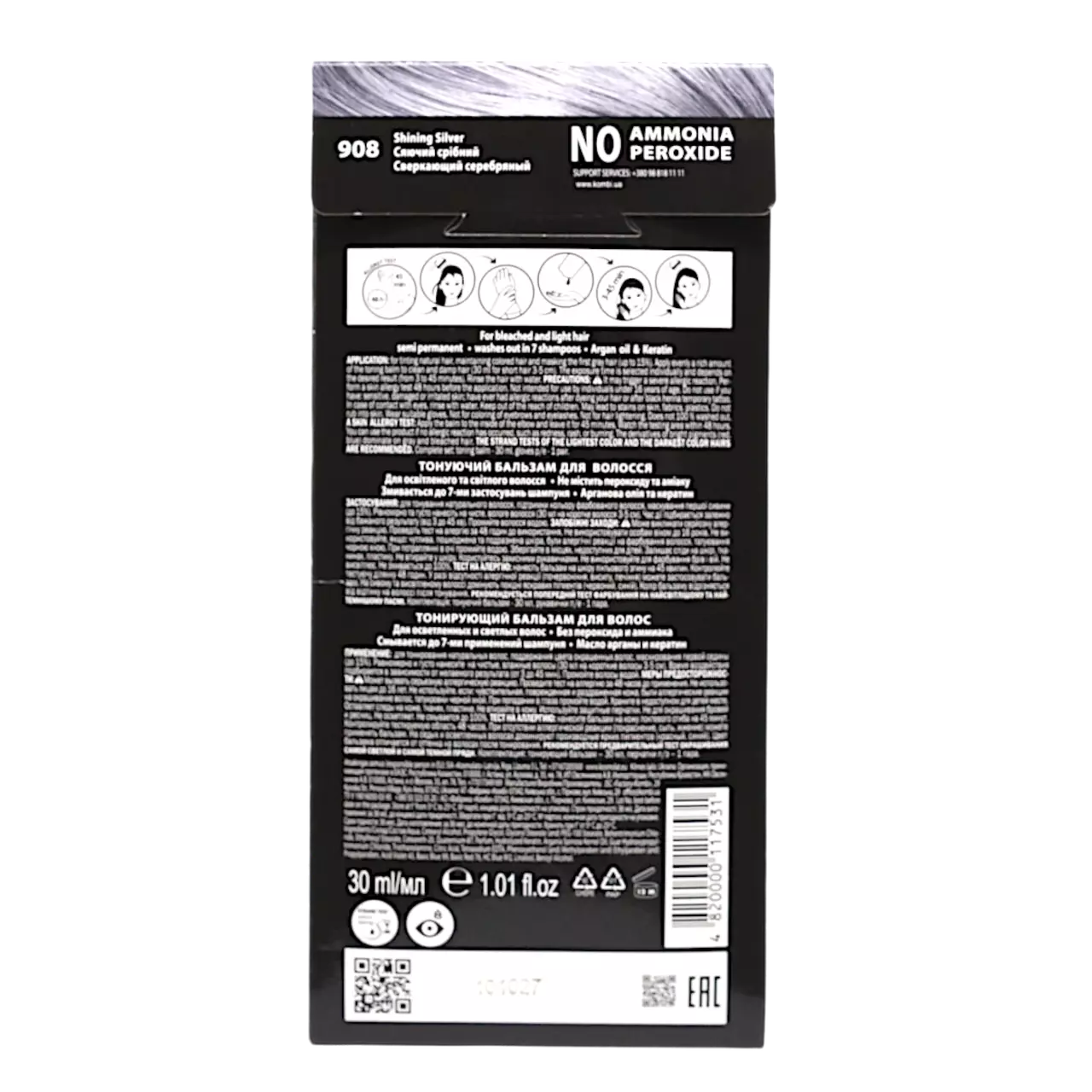 Об’єм 30 мл підходить для короткого або середнього волосся, надаючи йому розкішний сяючий срібний відтінок з елегантним блиском."