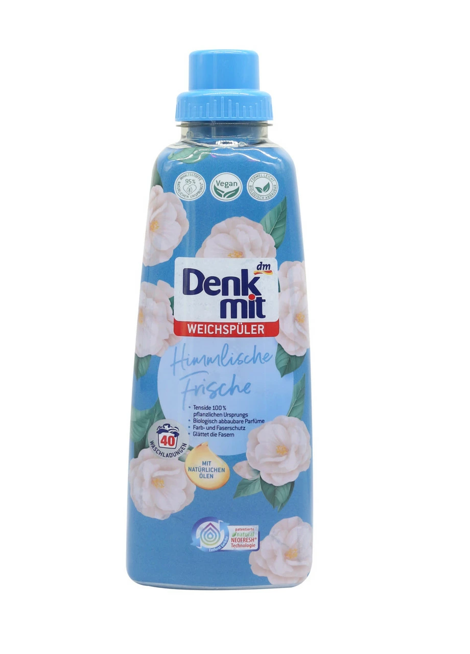 Кондиціонер для прання Denkmit Himmlische Frische полегшує прання і пом'якшує структуру тканин. Запобігає вимиванню кольорів з тканин та зберігає їх першочергову яскравість.