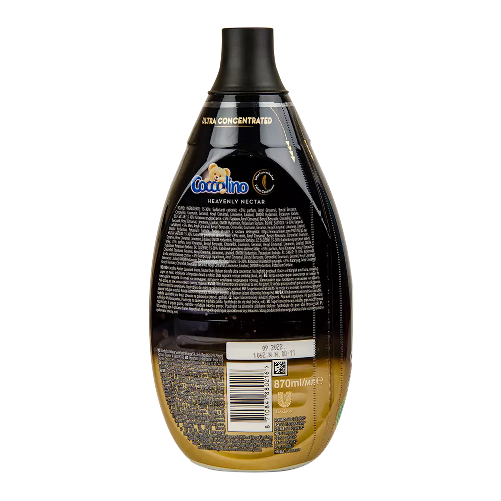 Супер концентрований пом'якшувач тканин належить до колекції Perfume Deluxe, яка виділяється своїми розкішними ніжними ароматами, створеними разом з експертами парфумерії. Пом'якшувальний божественний нектар з вишуканим і чарівним ароматом, яким буде пахнути ваша білизна. Він складається з теплого поєднання червоних фруктів, смачної ванілі, кедрового дерева, свіжого бергамоту та хмільних квітів духмяного frangipani. Окрім чудового аромату, пом'якшувач тканини також надасть вашому одягу велику турботу та допоможе підтримувати його якість. Після прання ваш одяг буде м’яким і його легше буде прасувати. Забудьте про парфуми та носіть розкішні аромати від Coccolin Teddy.