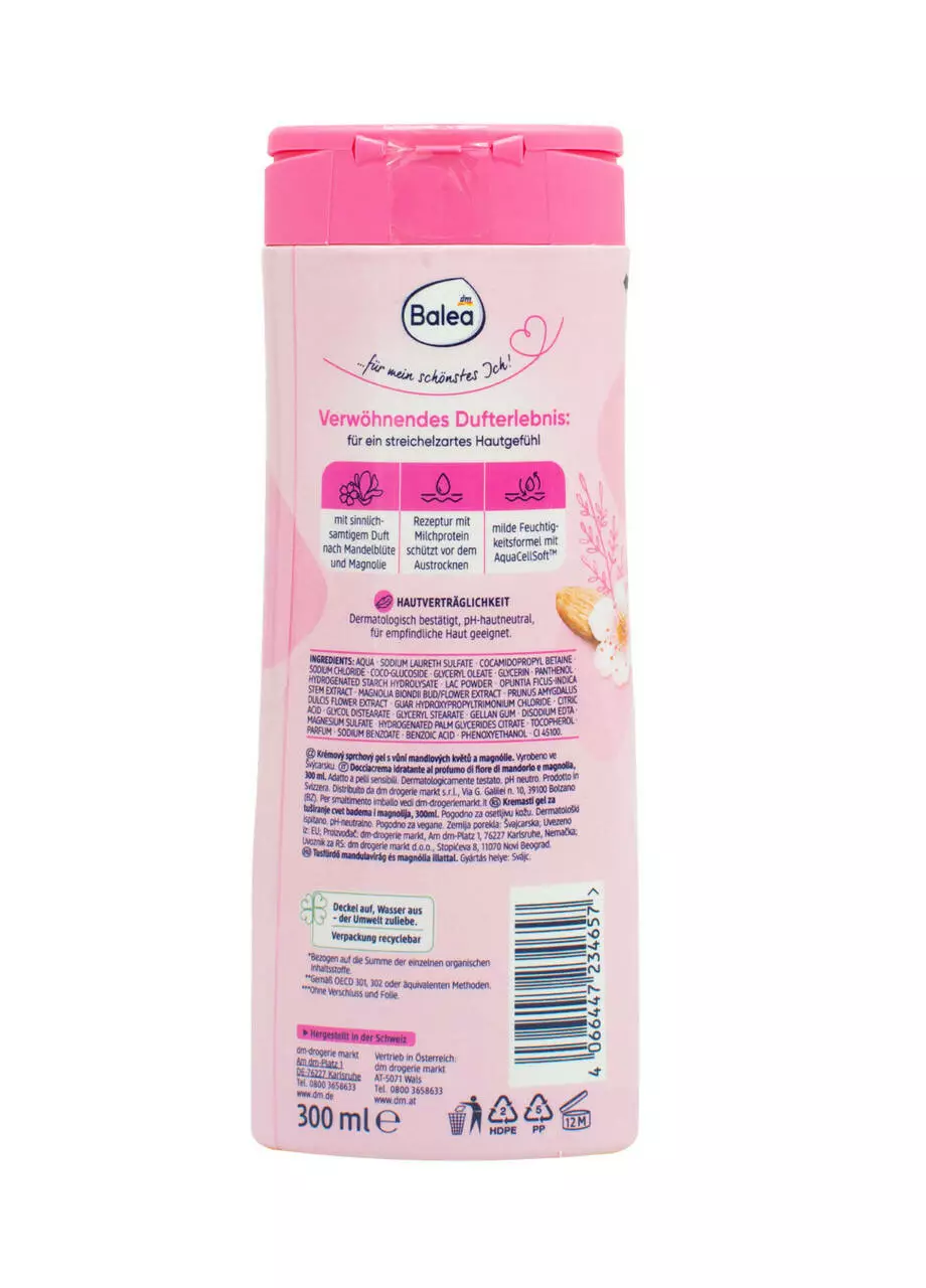 Balea – окремий косметичний світ, в якому переважають ніжність та турбота про кожну клітину шкірного покриву. Серед безлічі оригінальних доглядів цього бренда любителі комфортного приймання душу виділяють гель «Мигдаль і Магнолія». Він підкуповує не лише дуже романтичною назвою, а й не менш натхненним ароматом та консистенцією. Склад продукту теж відповідає найсміливішим уявленням про якісну європейську продукцію. Вам залишається лише отримувати задоволення від щоденних сеансів чистоти!