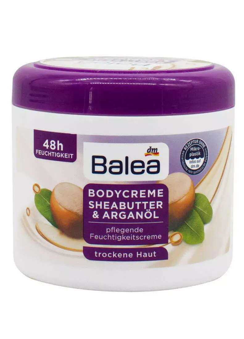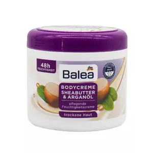 Крем Balea Body Cream Shea Butter & Argan Oil живить і пом'якшує шкіру, нейтралізує вплив жорсткої водопровідної води, позбавляє сухості та відчуття стягнутості, робить дерму пружною та еластичною. Олія ши насичує шкірний покрив вітамінами та мінералами, загоює мікротріщини та міні-ранки, розгладжує зморшки, активізує регенерацію клітин, стимулює вироблення колагену, уповільнює процеси старіння. Арганова олія зволожує, захищає від негативного впливу ультрафіолетового випромінювання та інших несприятливих факторів навколишнього середовища, регулює роботу сальних залоз, дарує епідермісу гладкість та м'якість. Засіб має ніжну консистенцію та приємний аромат, легко наноситься, швидко поглинається, не залишає липкої та жирної плівки.