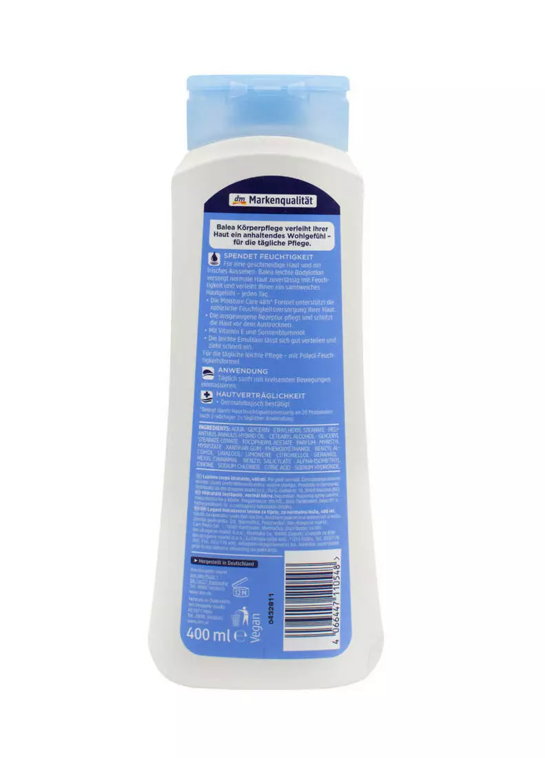 Легкий лосьйон для тіла Balea доглядає за шкірою з цінними рослинними продуктами. Для щоденного чудового самопочуття та свіжої еластичної шкіри. Легка емульсія лосьйону добре розприділяється і швидко вбирається. Має ніжний зволожуючий ефект.