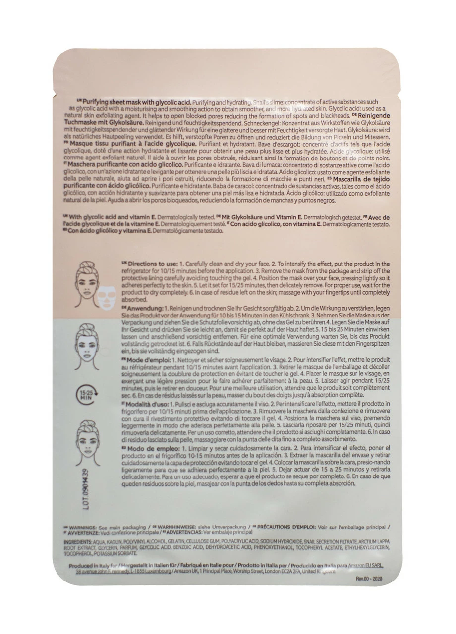 Очищуюча тканинна маска з гліколевою кислотою. Містить слиз равлика: концентрат активних речовин, таких як гліколева кислота, має зволожуючу та розгладжувальну дію для отримання більш гладкої та зволоженої шкіри. Гліколева кислота використовується як природний засіб для відлущування шкіри. Допомагає відкрити закупорені пори, зменшуючи утворення плям і чорних крапок.