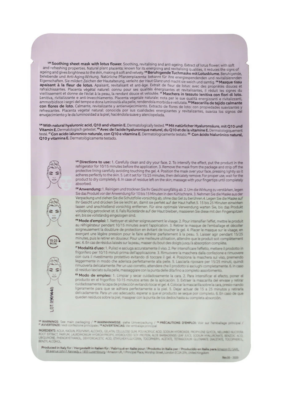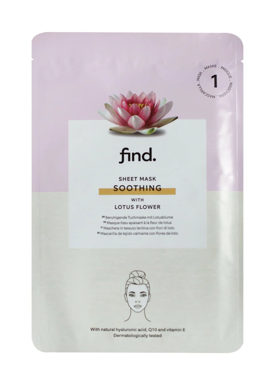 Заспокійлива листова маска Find з квіткою лотоса, гіалуроновою кислотою, Q10 і вітаміном Е. Маска з м'якими та освіжаючими властивостями. З натуральною рослинною плацентою, відомою своїми властивостями, що тонізують і оздоровлюють.