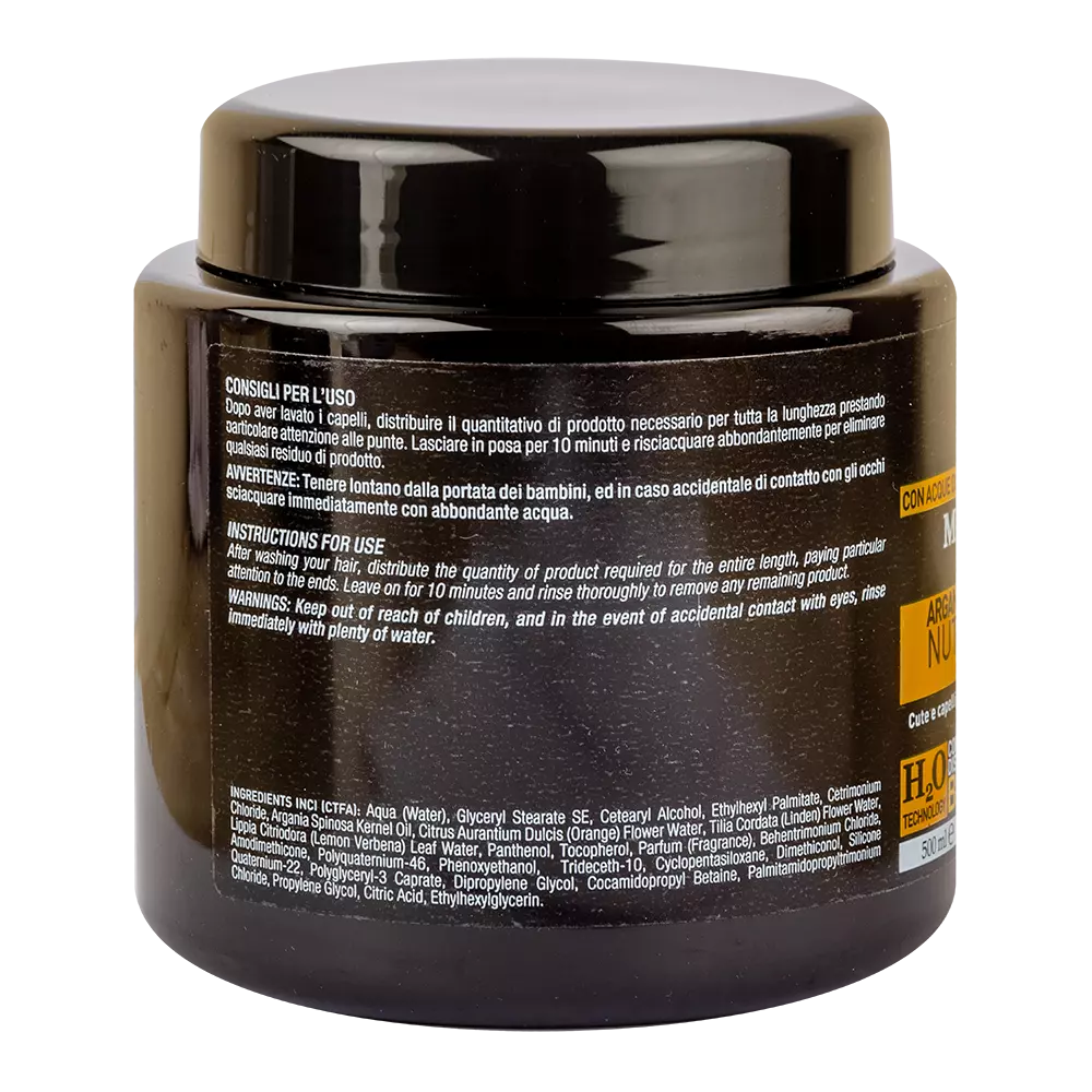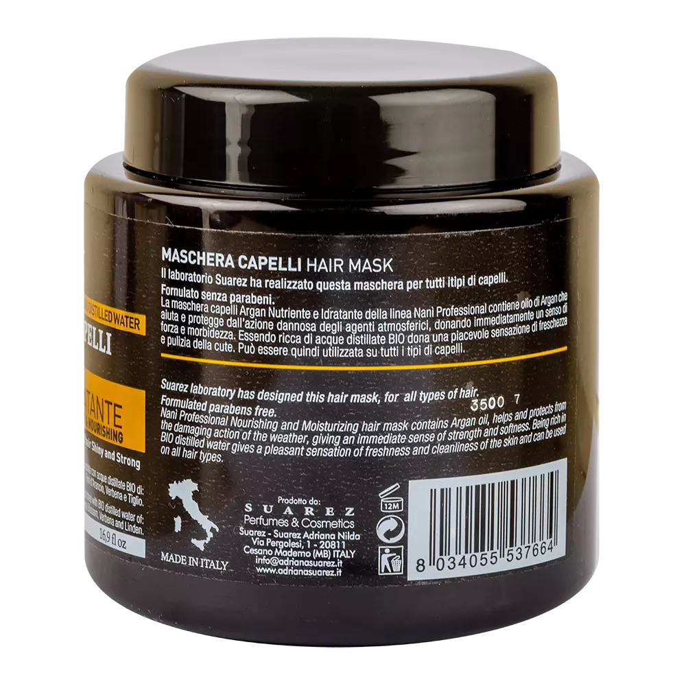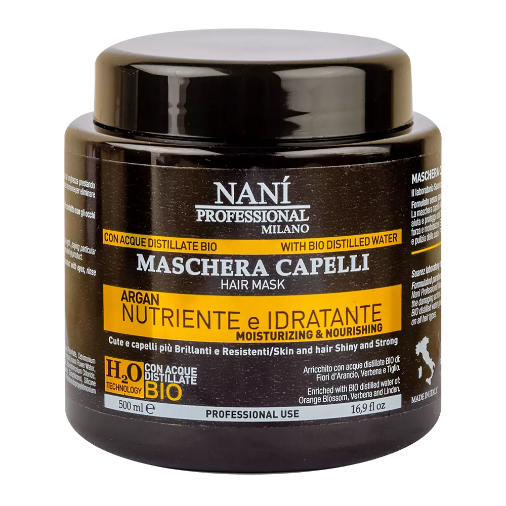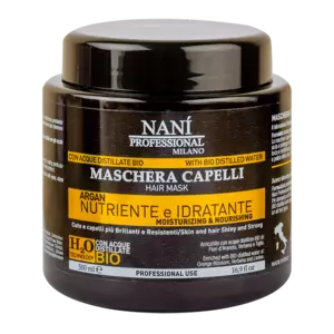 Поживна та зволожуюча маска для волосся з арганової серії професійної лінії Nanì, містить арганову олію, глибоко зволожує дуже пошкоджене волосся, надає йому природного блиску і захищає від шкідливого впливу навколишнього середовища. Для більш вираженого ефекту рекомендується застосовувати в комплексі з шампунем та бальзамом з цієї ж серії. Підходить як для професійного, так і для домашнього догляду за волоссям.