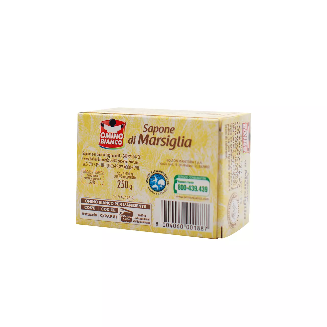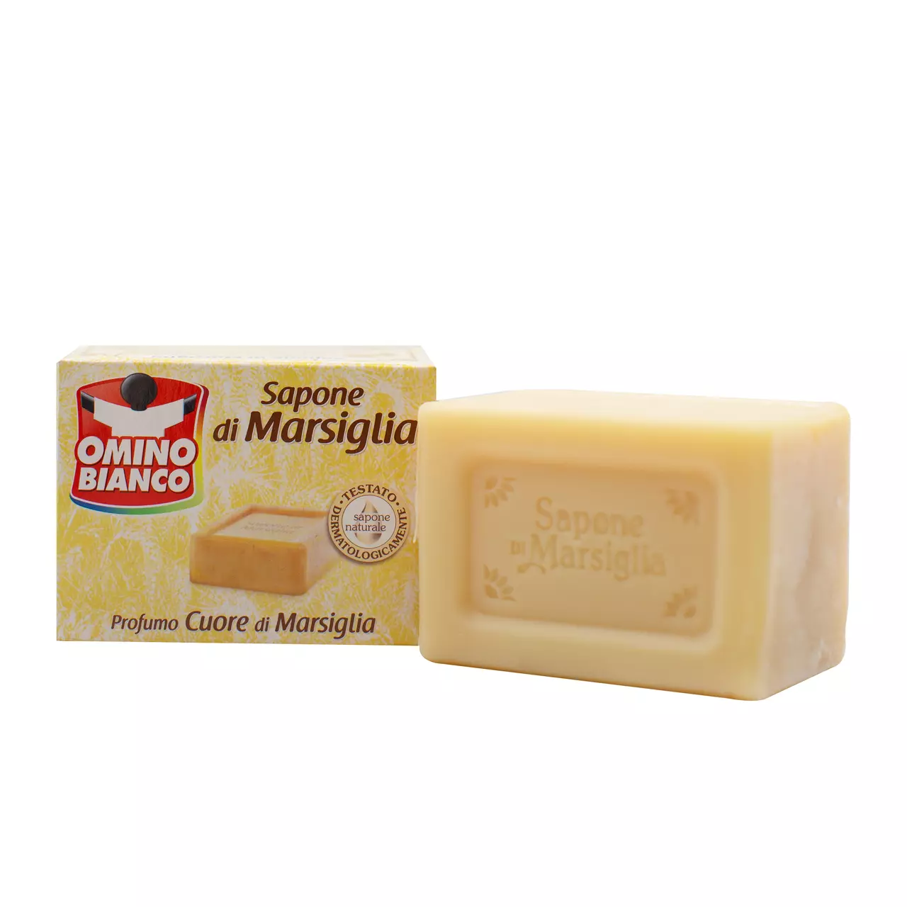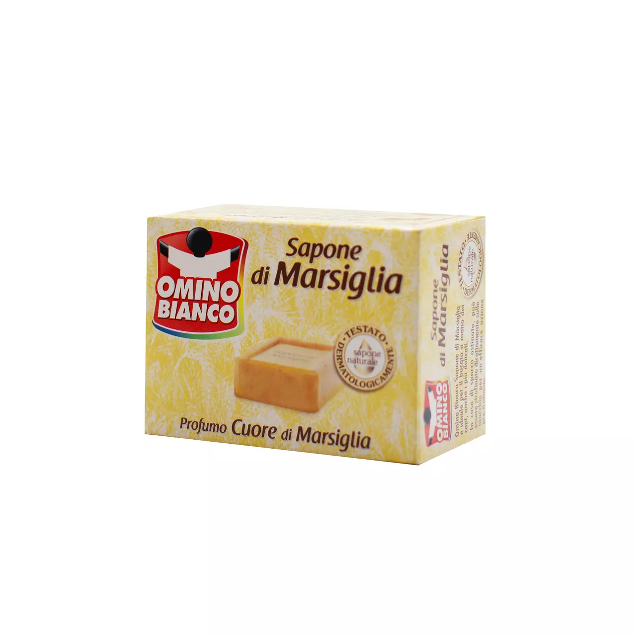 Omino Bianco Sapone di Marsiglia – класичне господарське мило, виготовлене з натуральних компонентів. Завдяки спеціальній формулі мило ефективно працює проти плям і стійких забруднень, при цьому дбайливо ставиться до тканин і кольорів, насичує білизну ароматом чистоти. Ідеально підходить для ручного прання, навіть найделікатнішого одягу. При сильних та стійких забрудненнях рекомендується використовувати мило для ефективної попередньої обробки, наносячи його безпосередньо на тканину.