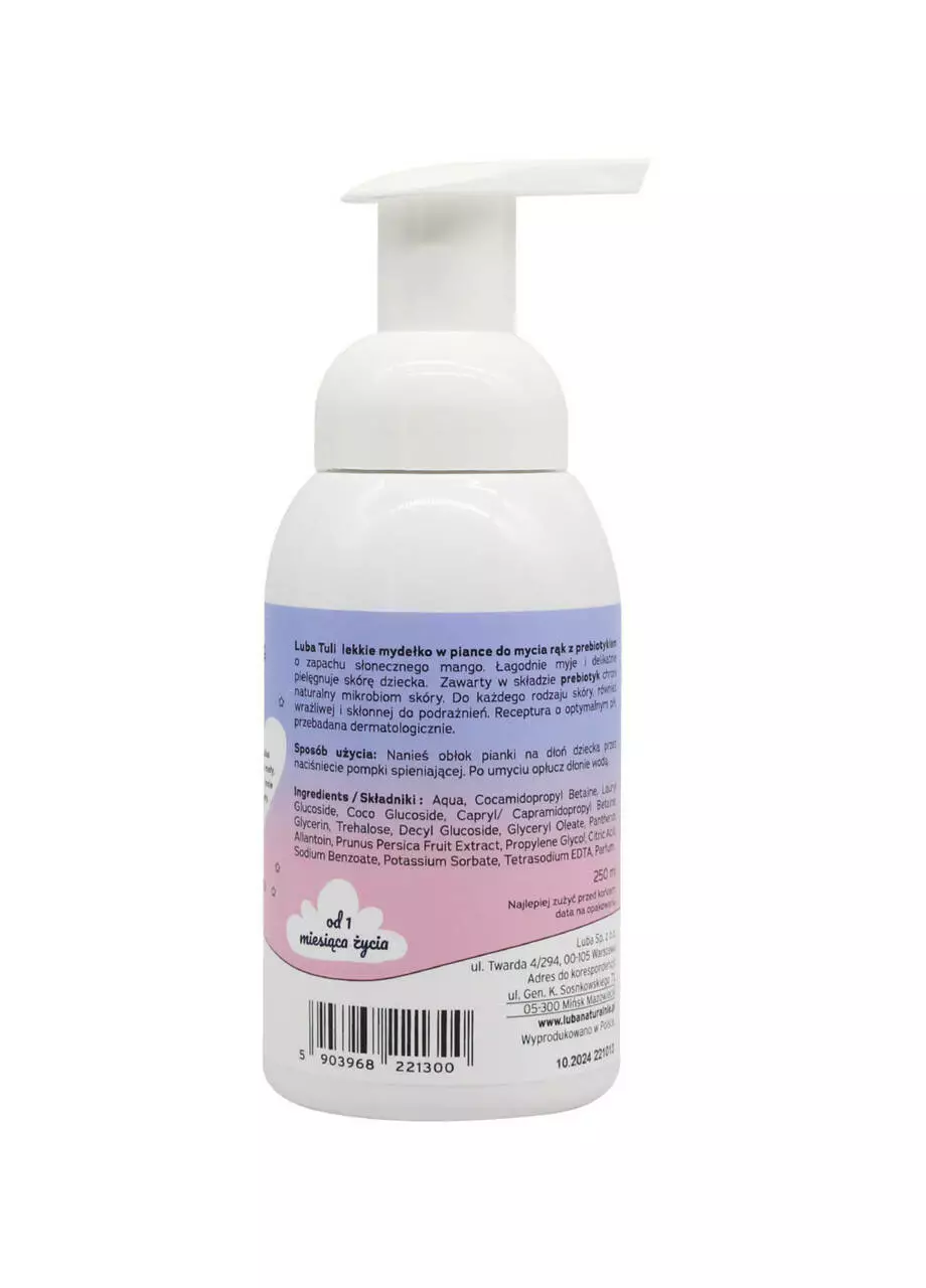 Легке пінне мило для рук Luba Tuli із пребіотиком із ароматом сонячного манго. М'яко очищає і дбайливо доглядає шкіру дитини. Пребіотик, що міститься в складі, захищає природний мікробіом шкіри. Для всіх типів шкіри, включаючи чутливу та схильну до подразнення. Дерматологічно протестована, рН-оптимізована формула.