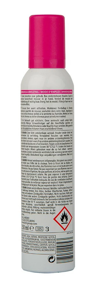 Застосування: перед вживанням струшувати. Повернути балон догори дном і видавити пінку на долоню. Рівномірно розподілити по волоссю. Не змивати. Зробіть зачіску.