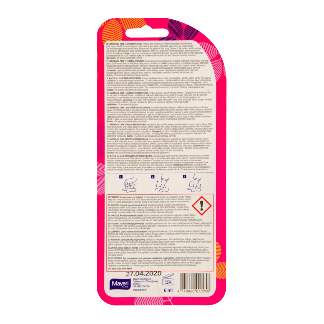 Спосіб застосування: зібрати залишки їжі, якщо є. За допомогою аплікатора нанести засіб на пляму та терти наконечником до повного зникнення плями. Після чого сполоснути місце забруднення водою. Після використання аплікатор протерти або ополоснути та щільно закрити ковпачок.
