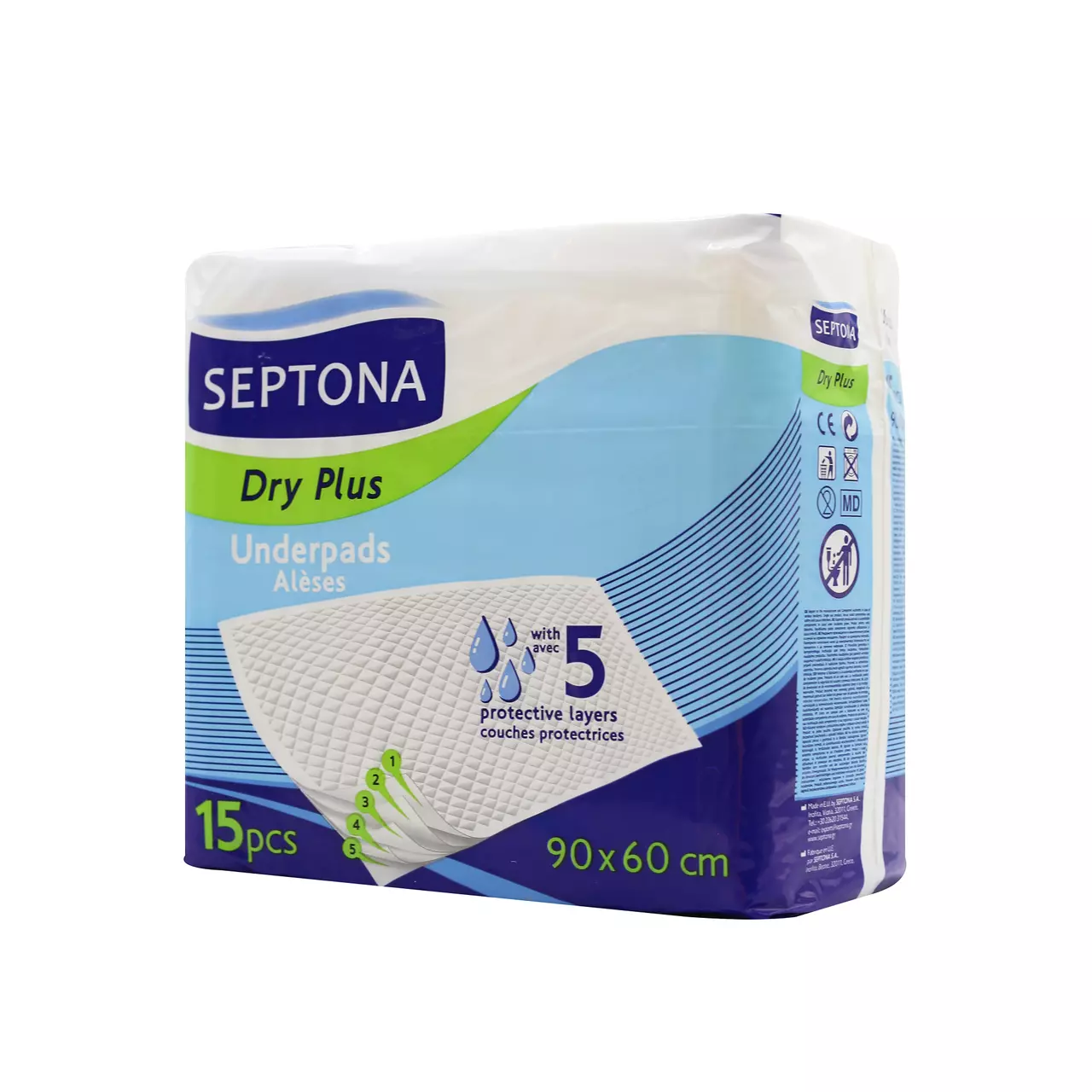 Пелюшки Septona Dry Plus забезпечують високу поглинаючу здатність завдяки 5 шарам захисту та ідеально підходять для нетримання сечі та післяопераційних ситуацій. Вони мають стьобану поверхню для ефективної дифузії рідин, суперабсорбуючу основу з технології SAP (Super Absorbing Polymer) для утримання вологи всередині та водонепроникну задню поверхню, яка не ковзає.