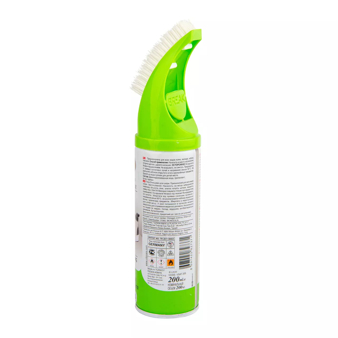 Спосіб застосування: Перед застосуванням перевірте на непомітному місці виробу. Струсіть балон. Нанесіть на забруднену поверхню, тримаючи балон вертикально розпилювачем вгору. Протріть поролоновою губкою. Підходить для очищення внутрішньої поверхні взуття. Не треба змивати водою.