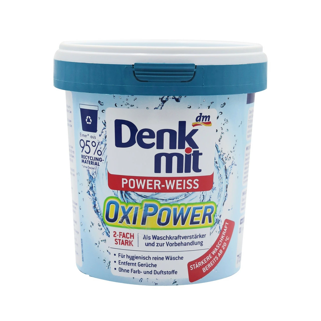 Denkmit OXI Power - засіб для виведення плям для білих речей. Формула з активним киснем ефективно справляється з видаленням плям від кави, червоного вина, зеленої трави, фруктів, овочів та мейк-апу. Можна використовувати для запирання одягу та спецодягу, дитячих речей, а також для постільної білизни.
