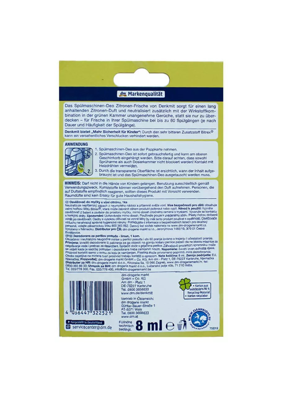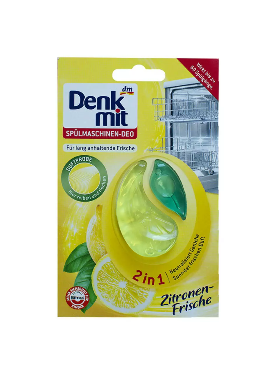 Denkmit Spülmaschinen-Deo Zitronen Frische — це нейтралізатор запаху та освіжувач для посудомийних машин. Засіб з ароматом лимона має подвійну формулу, тому не просто маскує, а саме нейтралізує неприємні запахи. Освіжувач має повністю безпечний склад.