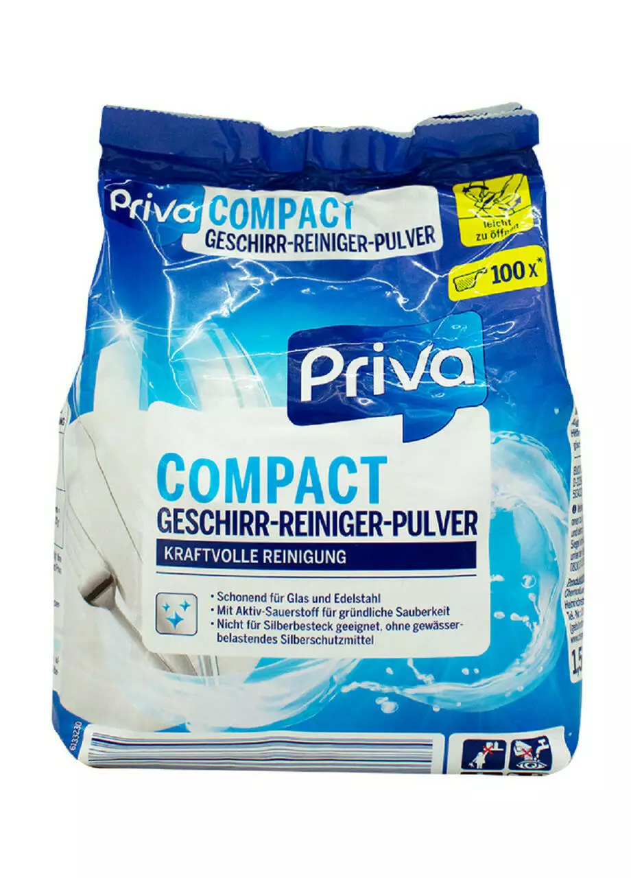 Порошок для миття посуду в посудомийних машинах Priva видаляє навіть найсильніші забруднення й водночас не стирає декорування. Підходить для всіх посудомийних машин. Перешкоджає виникненню накипу на деталях посудомийної машини.