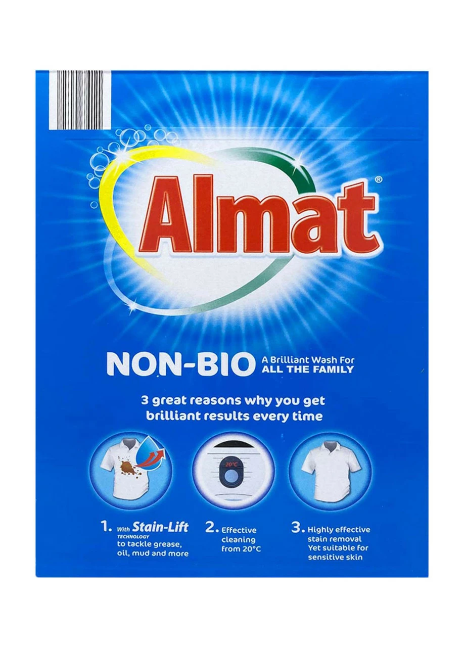 Almat Non-Bio є гіпоалергенним засобом для прання і протестованим дерматологами. Підходить для прання дитячої білизни. Порошок розроблений за розширеною формулою, яка ідеально виводить плями навіть від кави, томатів, іржі, крові навіть при низьких температурах, при цьому не псує тканину і усуває неприємні запахи. Після прання речі приємно пахнуть і дуже м'які на дотик.