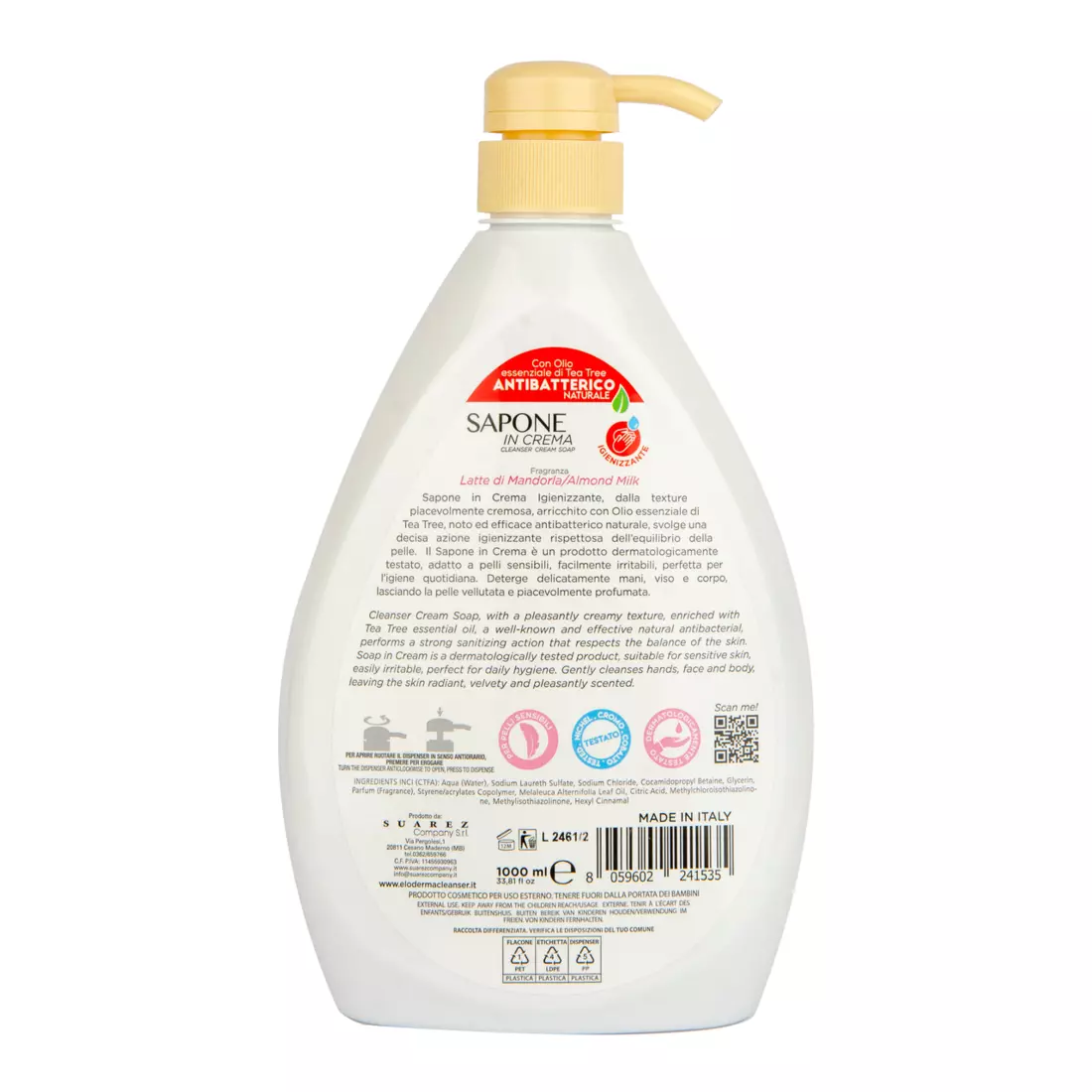 Крем-мило з приємною кремовою текстурою, збагачене ефірною олією чайного дерева, добре відомою як природний антибактеріальний засіб. Має сильну дезінфікуючу дію, дотримуючись балансу шкіри. Дерматологічно протестований продукт, підходить для чутливої шкіри. М’яко очищає руки, обличчя та тіло, роблячи шкіру сяючою, шовковистою та залишає приємний аромат.