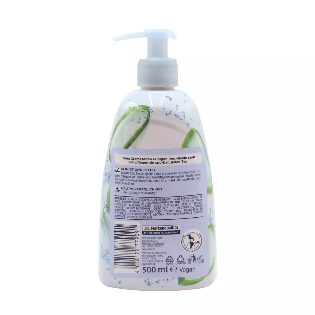 Рідке крем-мило з алое вера Balea Sensitive — антибактеріальний засіб, який зволожує і пом’якшує. Формула засобу не порушує рН-баланс, що допомагає уникнути виникнення сухості та подразнень.