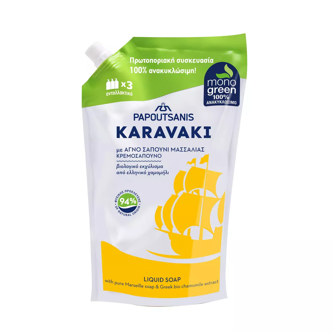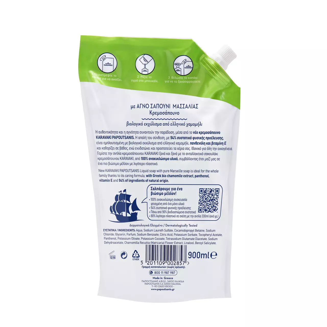 Автентичність і чистота зустрічаються з традиціями в новому крем-милі KARAVAKI PAPOUTSANIS. Його ніжний склад, що складається з 94% інгредієнтів натурального походження, збагачений органічним екстрактом грецької ромашки, пантенолом і вітаміном Е, глибоко очищає, водночас зволожує та захищає ваші руки. Ідеально підходить для всієї родини.