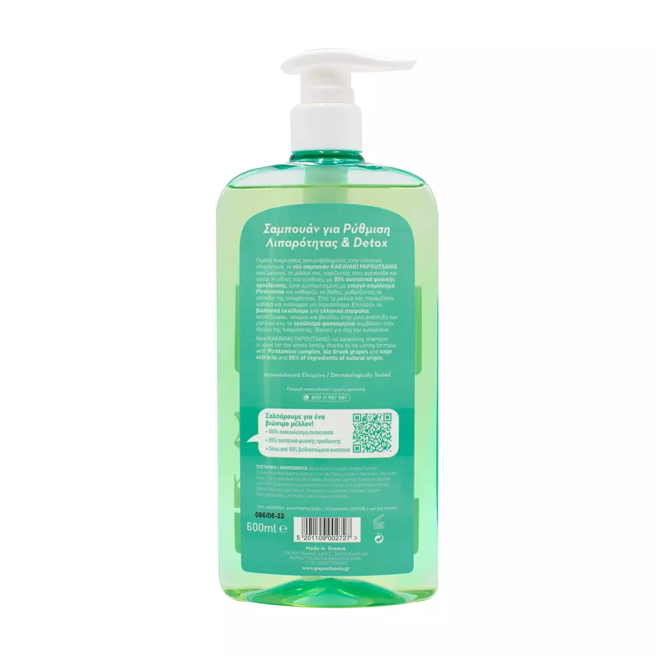 Його особливий склад, що складається з 95% інгредієнтів натурального походження, збагачений активним комплексом Піроламін і глибоко очищає, регулюючи рівень жирності. Так ваше волосся довше залишається чистим і світлим. Крім того, органічний екстракт грецького винограду виводить токсини, стимулює та сприяє здоровому росту волосся, тоді як екстракт шавлії допомагає контролювати жирність. Ідеальний варіант для всієї родини.
