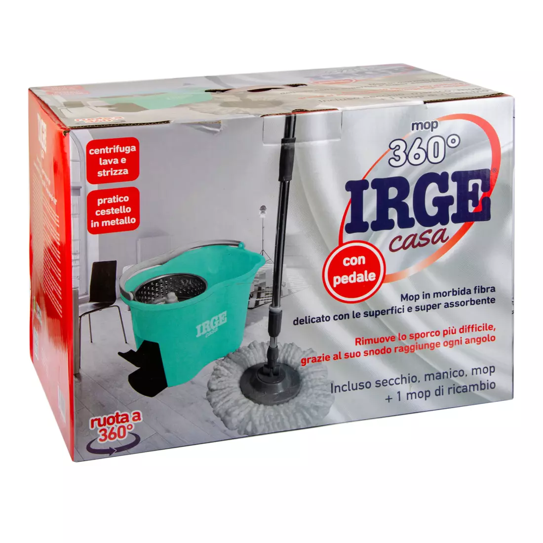 Super Mop 360° IRGE з практичним металевим кошиком. Суперабсорбуюча та безпечна для поверхні швабра з мікрофібри. Швабра зі зручною ручкою з поворотом на 360° дає змогу очистити навіть у важкодоступних місяцях, таких як кути, отвори між меблями, ліжком і т.д. Дуже добре підходить для миття підлог та паркету. Швабра дуже проста у використанні. Ківш оснащений спеціальною муфтою для запобігання розбрискуванню води під час центрифугування швабри. Мікроволокна дозволяють делікатно та без подряпин очистити всі види поверхонь.