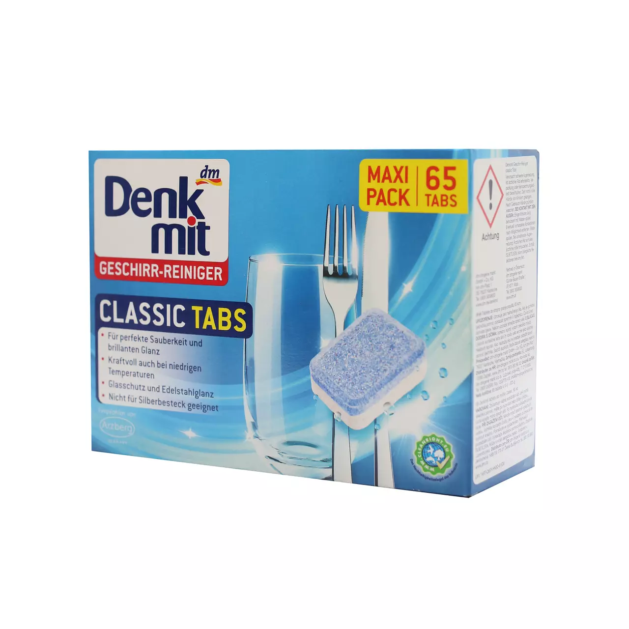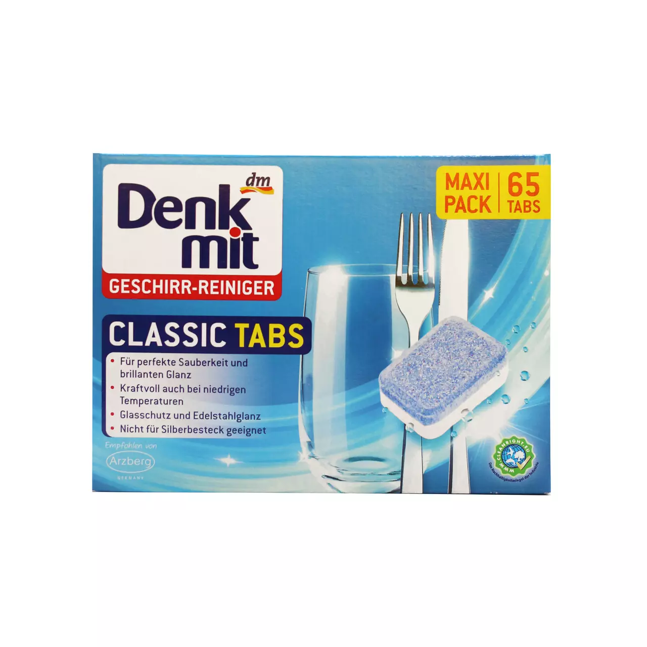 Революційна формула Denkmit "Classic" у таблетках ефективно очищає брудний посуд, надає йому чистого сяючого вигляду, при цьому зберігаючи художні візерунки на посуді, протидіє плямам від води та утворенню вапняного накипу. Запобігає природному помутнінню скляного посуду. Denkmit Tabs ефективно очищає кухонні прилади зі срібла та нержавіючої сталі.