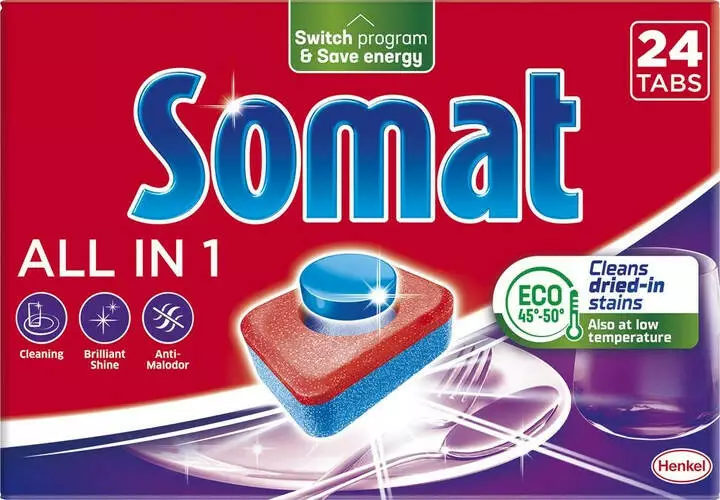 - Захист скла та візерунків на посуді: Таблетки Somat "Все в одному" забезпечують захист скла та візерунків на посуді, запобігаючи їх пошкодженню.