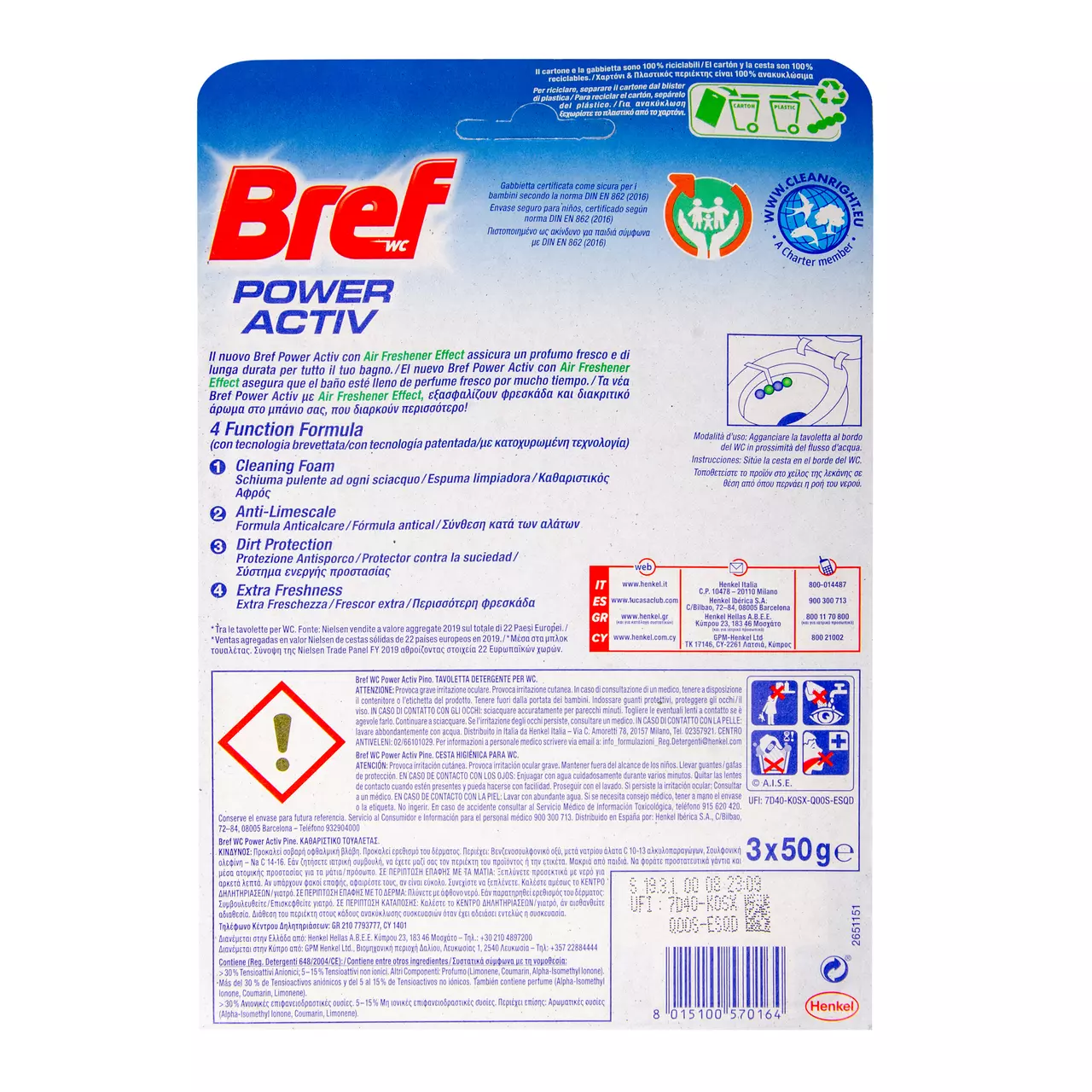 Туалетні блоки для унітазу Bref Power Aktiv Сосновий ліс 3×50 грам. Тверді туалетні блоки Bref – незвичайні за своїм дизайном та унікальні за своєю дією. При змиванні Bref Power Aktiv утворює активну піну, яка ефективно очищає поверхню унітазу та запобігає утворенню вапняного нальоту. Окрім потужної формули, продукт надає приємного аромату Вашій туалетній кімнаті.
