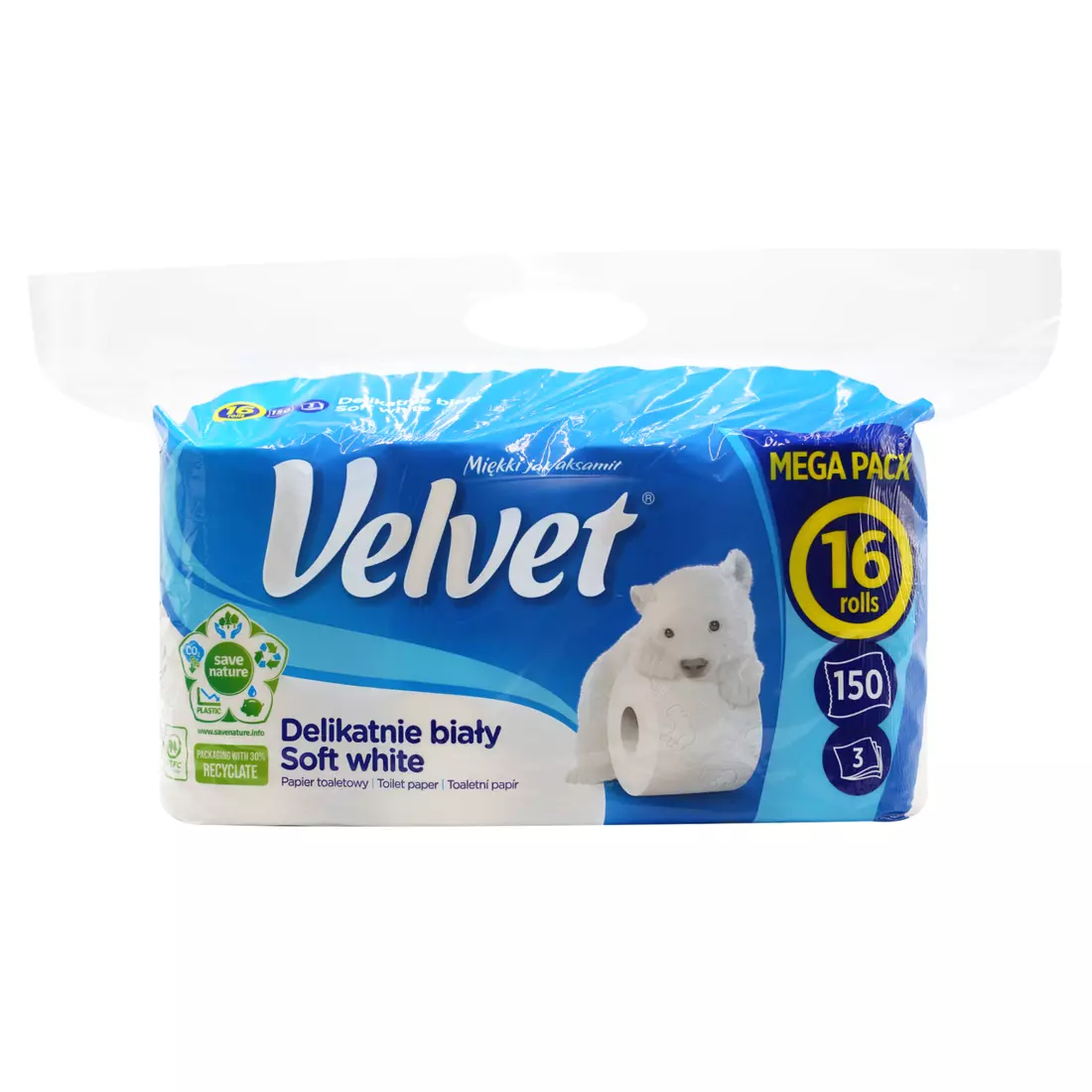 Туалетний папір Velvet Soft White складається з трьох шарів м'якого цигаркового паперу в поєднанні з ніжним рельєфним візерунком з фігурками ведмедиків. Кожен аркуш - це оптимальне поєднання міцності та оксамитової м'якості паперу Velvet.