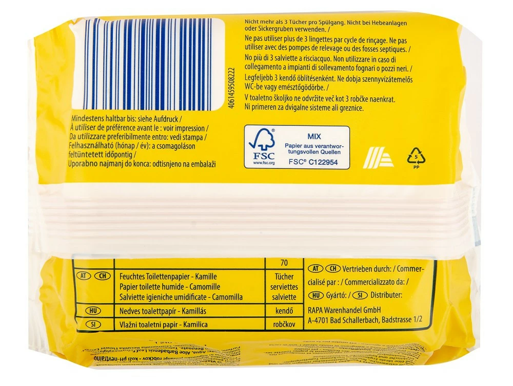 У разі потрапляння в лужне середовище каналізації розчиняється (у разі змивання не більш ніж 3 аркуші за раз). Не містить спирту, силіконів і барвників.