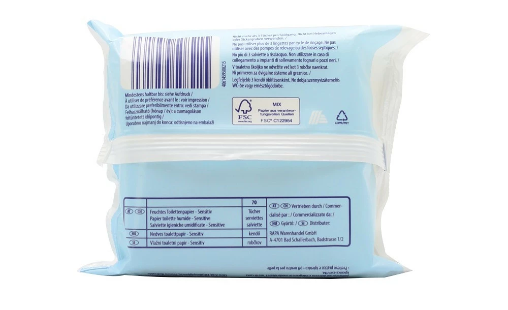 У разі потрапляння в лужне середовище каналізації розчиняється (у разі змивання не більш ніж 3 аркуші за раз). Не містить спирту, силіконів і барвників.