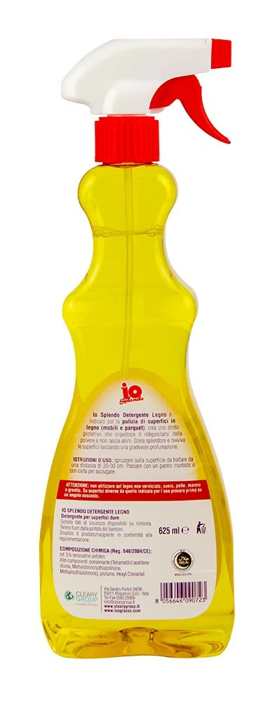 Делікатний продукт, придатний для чищення дерев'яних поверхонь, меблів та паркету. Спеціальний продукт, який створює захисний шар на всіх дерев'яних меблях і запобігає осіданню пилу, не залишаючи слідів або розводів. Полірує та захищає ваші найніжніші меблі, надає блиск та відновлює поверхні.