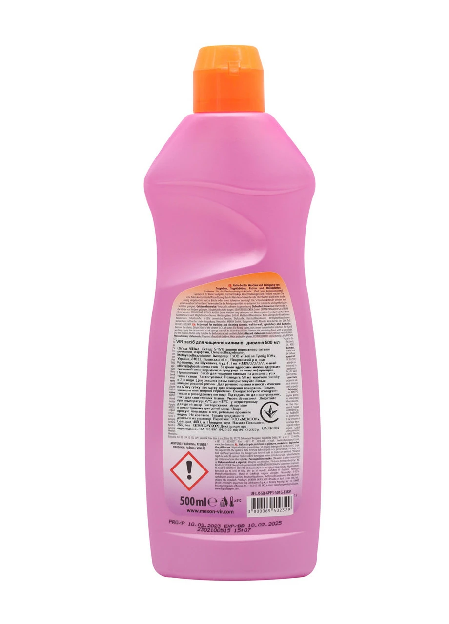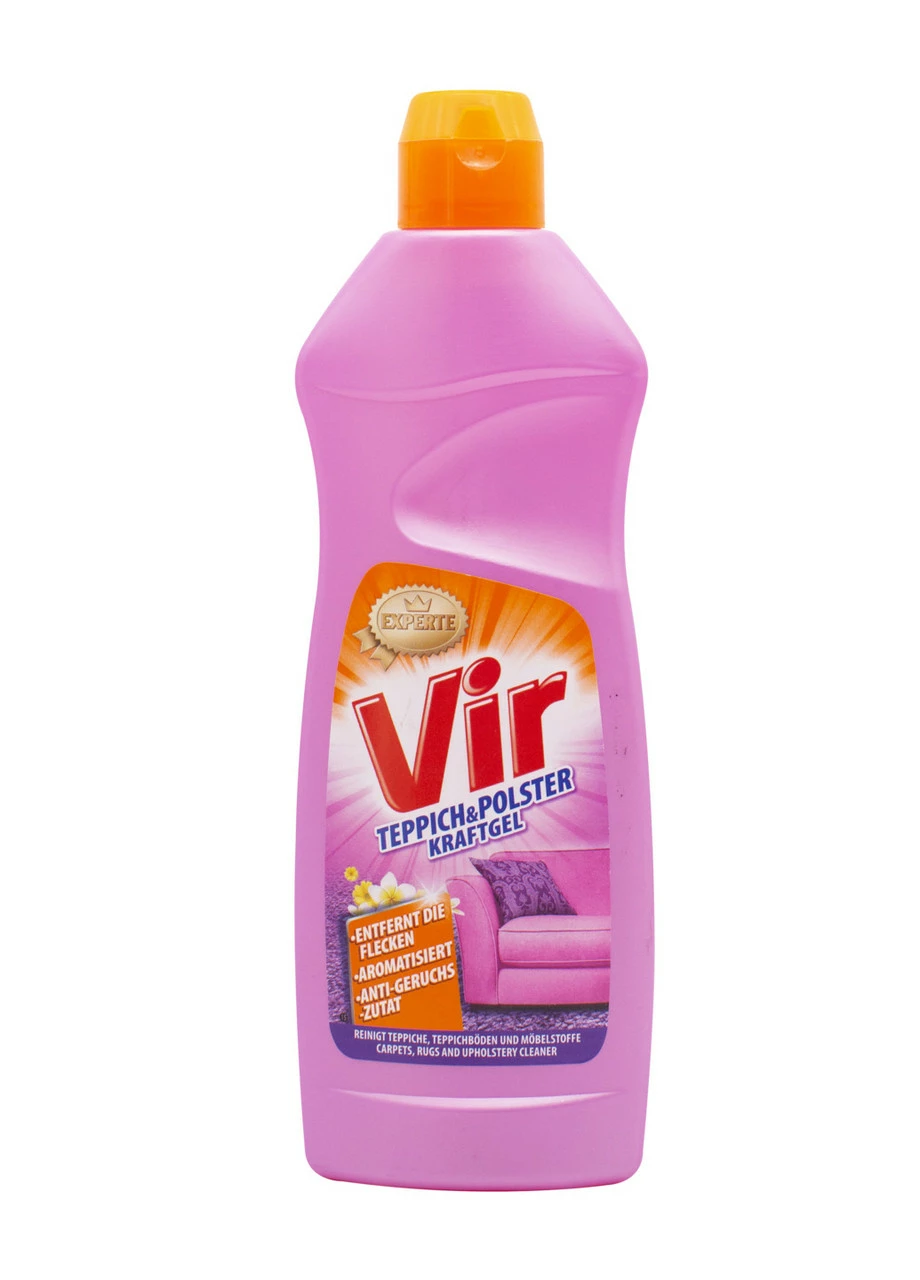 Vir- найкраще рішення для видалення плям і чищення килимів, настінних покриттів, оббивки та штофів. Завдяки своїй потужній дії концентрований і економічний гель видаляє складні плями та стійкі забруднення, залишаючи чистий і свіжий аромат. З добавкою проти запаху.