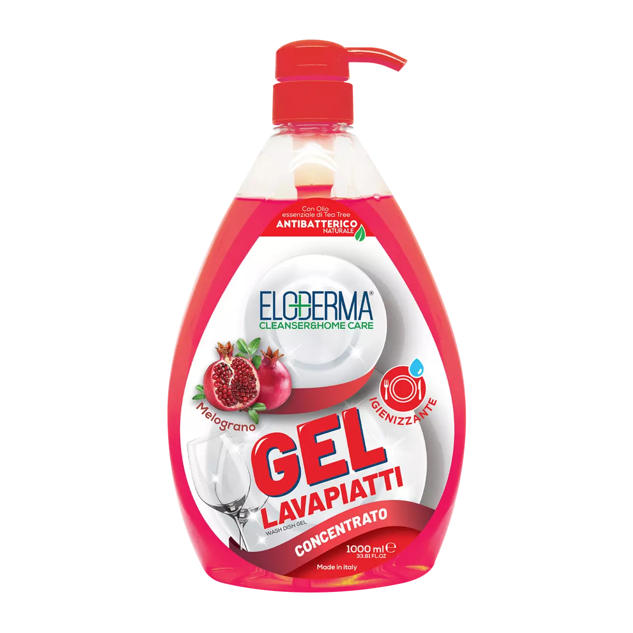 Гель для миття посуду з потужною знежирюючою та очисною дією. З інтенсивним ароматом гранату, майже парфумована вода для посуду. З ефірною олією чайного дерева відомий природний антибактеріальний засіб. Завдяки формулі з нейтральним рН, ніжний до рук, не сушить шкіру.