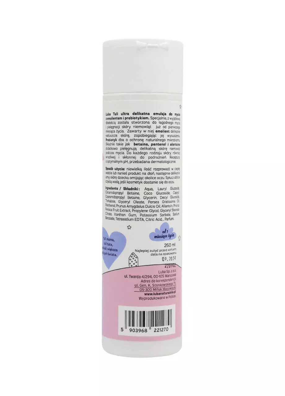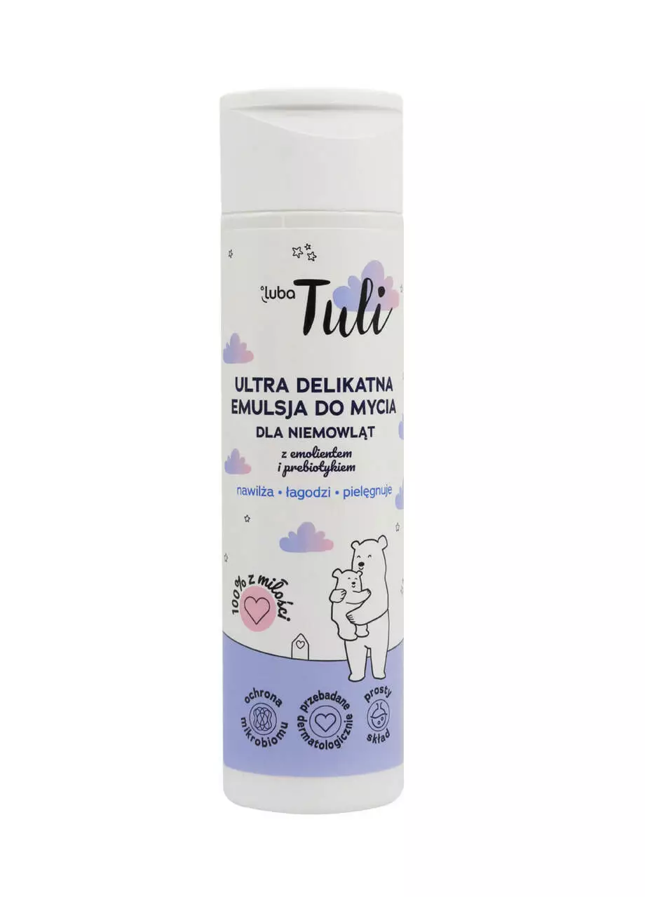 Ультраніжна емульсія для миття Luba Tuli з емолентом та пребіотиком. Спеціально розроблена з особливою ретельністю для дбайливого миття та догляду за шкірою немовлят з першого місяця життя. Емолент, що міститься в ній, м'яко змащує шкіру, запобігаючи її висиханню. Пребіотик дбає про захист природного мікробіома. Такі інгредієнти, як пантенол та алантоїн, додатково живлять ніжну шкіру немовлят під час миття.