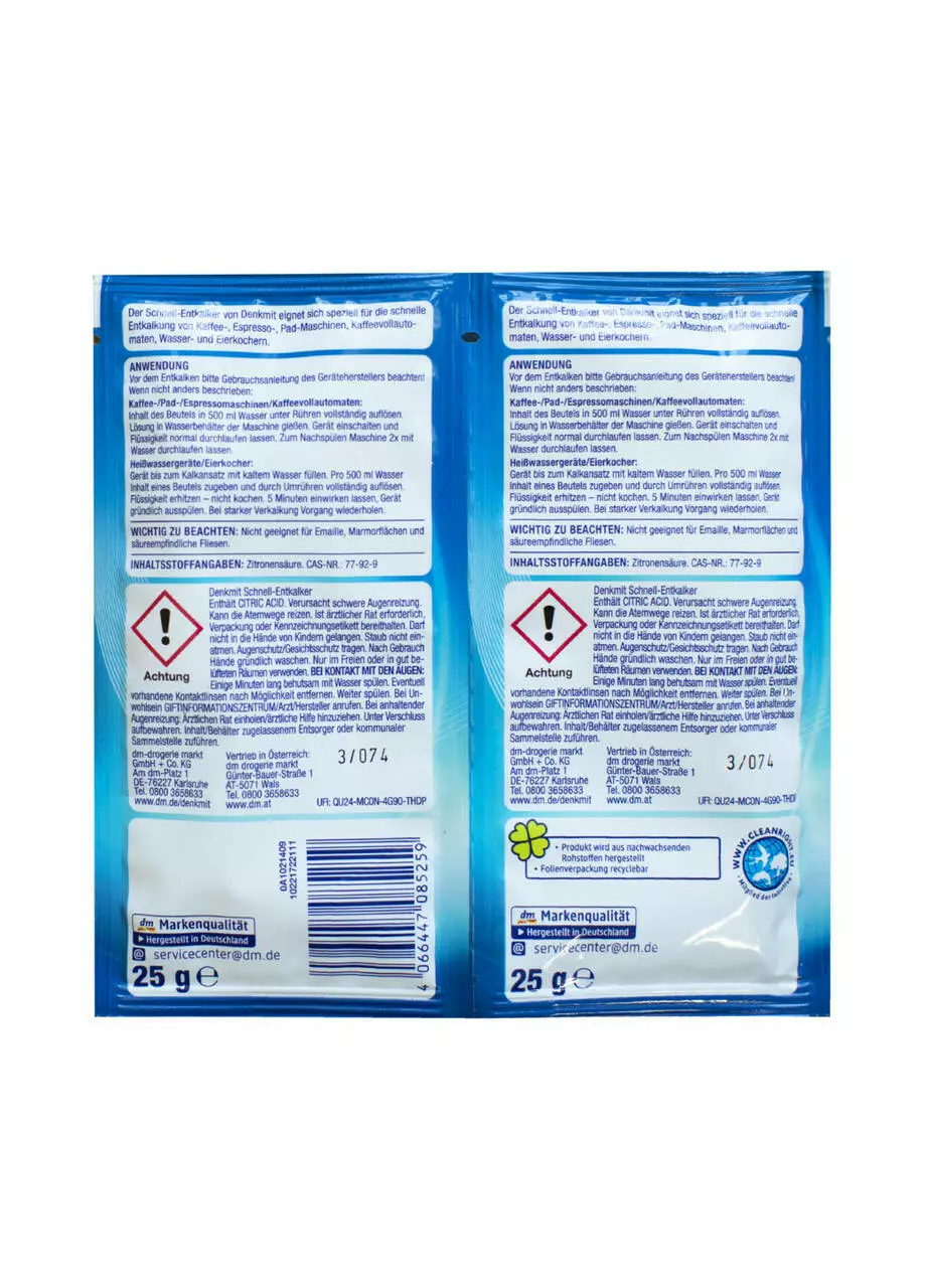Denkmit Порошок від накипу 2*25g дуже ефективно розщеплює, а потім видаляє весь накип. Очисник нешкідливий для здоров'я, а також не шкодить кухонним приладам та техніці. Оскільки німецький засіб складається з органічної хімії. Створено на основі лимонної кислоти.