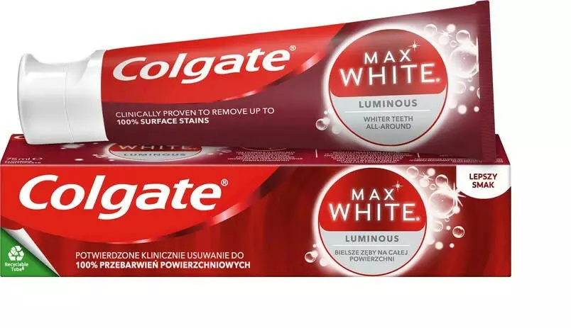 З використанням зубної пасти Colgate Max White Luminous ви можете досягти ретельного очищення, відбілювання зубів та видалення нальоту, а також насолодитися свіжістю та приємним смаком.