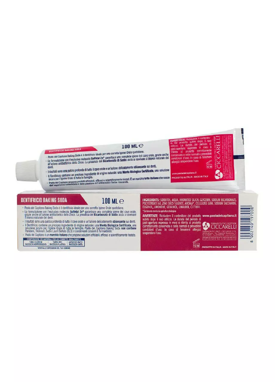 100% італійський продукт із натуральних інгредієнтів. Завдяки вмісту бікарбонату натрію і фтору зубна паста Pasta del Capitano Baking Soda гарантує делікатне вибілювання. А її формула допомагає нейтралізувати бактеріальні кислоти зубного нальоту, забезпечуючи ефективний захист порожнини рота.