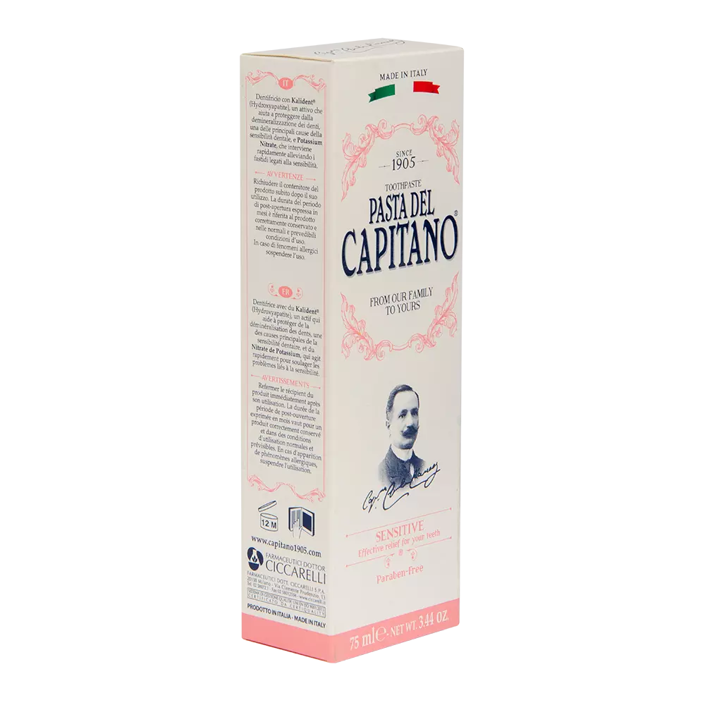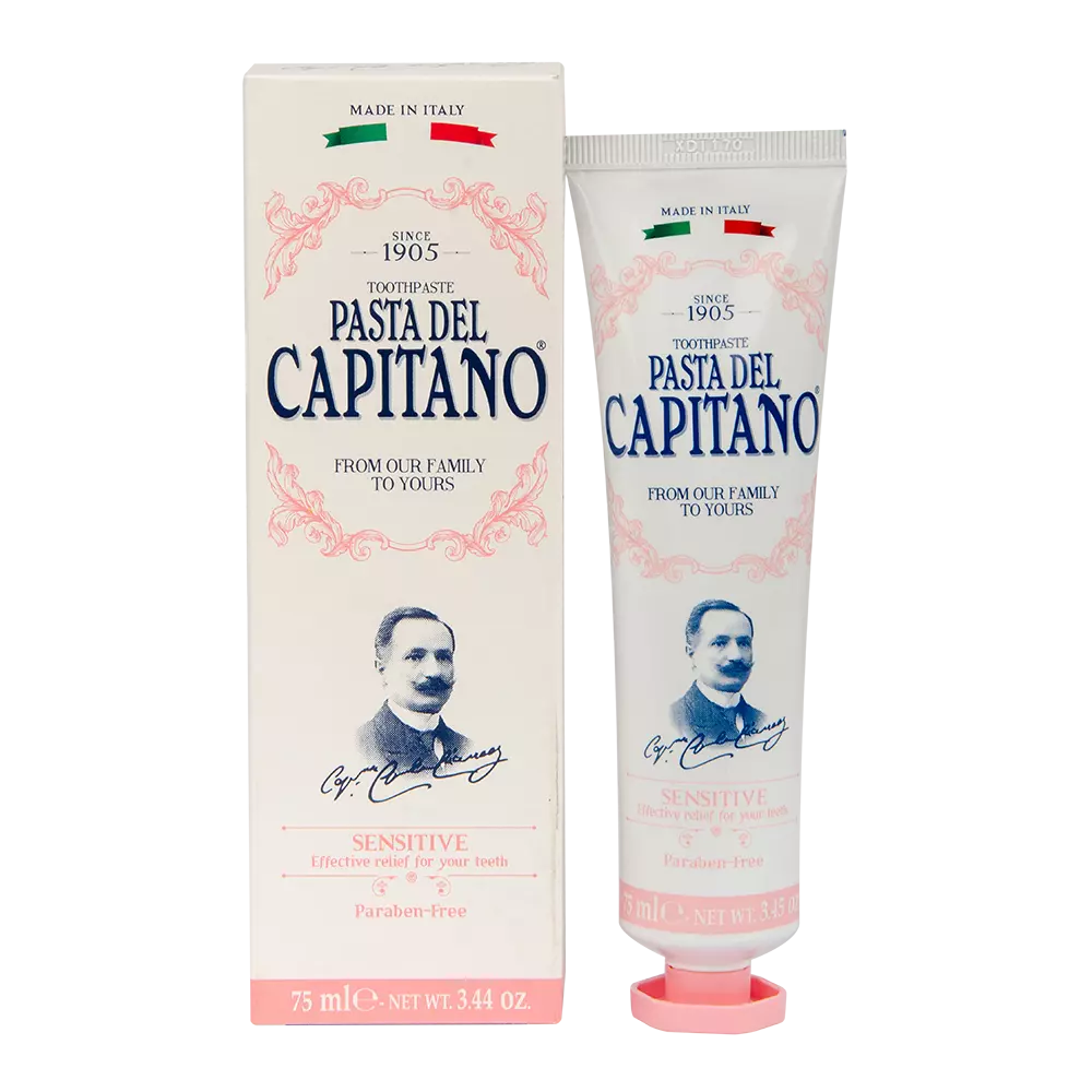 Pasta Del Capitano Premium Sensitive розроблена спеціально для того, щоб вирішити проблему чутливості зубів. У складі продукту знаходиться спеціальний компонент, який перешкоджає демінералізації зубів, зміцнює ослаблену емаль, повертає їй колишній здоровий вигляд. Паста чудово очищає зуби від пігментованого нальоту, має антибактеріальний ефект, допомагає зберегти свіжість подиху на тривалий час. Pasta Del Capitano Premium Sensitive - це чудова профілактика і захист зубів від карієсу.
